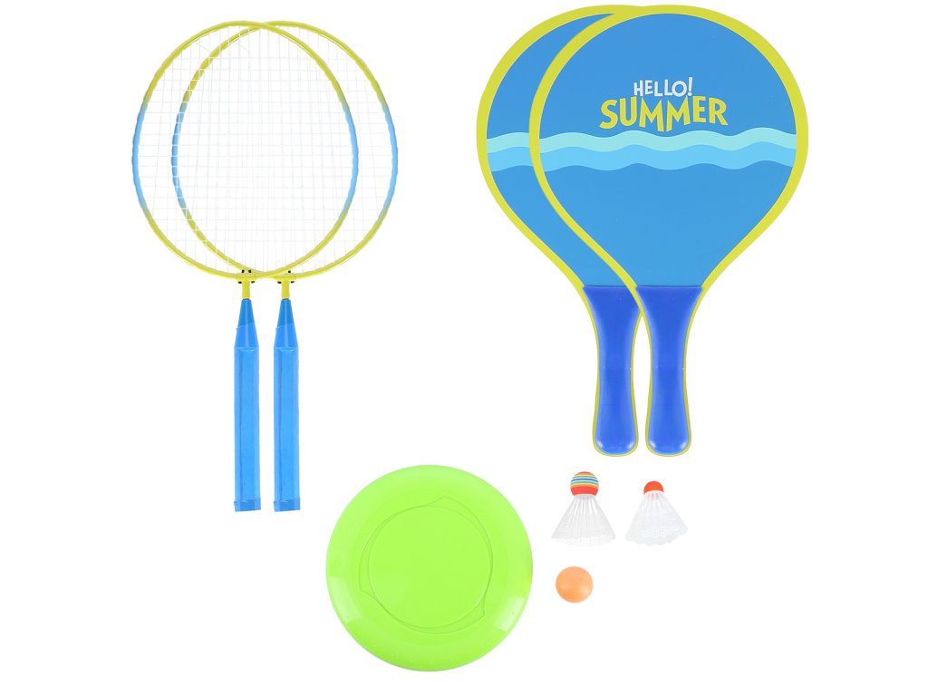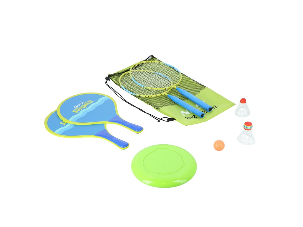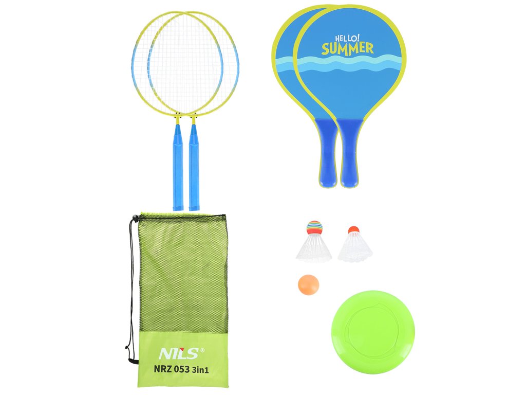NILS NRZ053 je sada, která obsahuje dvě ocelové rakety, dvě dřevěné rakety, dvě letky, gumový míček a plastové frisbee.