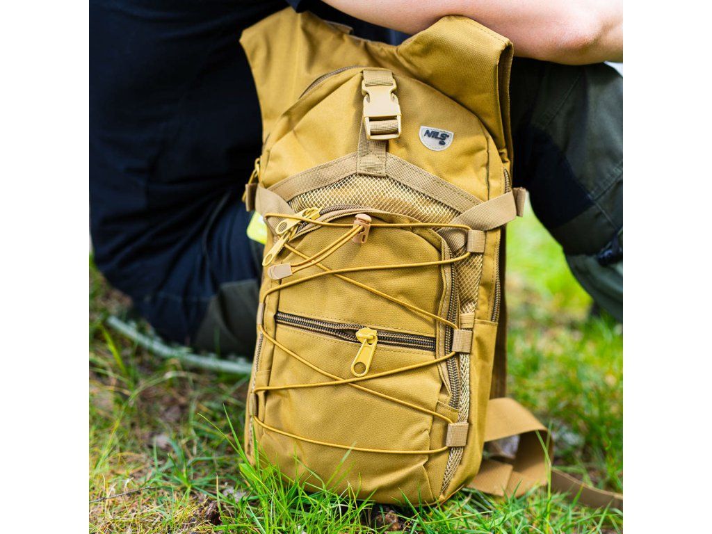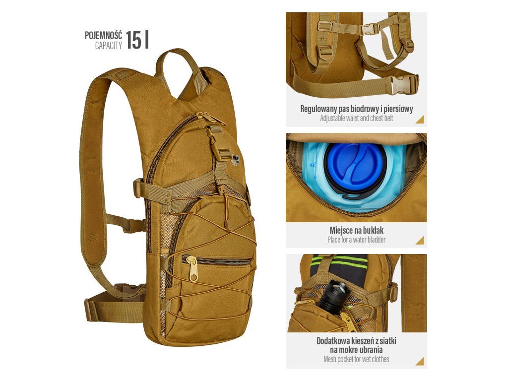 Hlavní komora batohu je opatřena přepážkou, v horní části se nachází 2 karabiny pro zavěšení hydrovaku (není součástí dodávky). Hadičku hydrovaku lze vyvést průvlaky na pravé i na levé straně pod ramenními panely. Na hlavní komoře se nacházejí další úložné prostory a to velká síťovaná kapsa s popruhem a přezkou - menší otevřená, síťovaná kapsa - 2. komora na zip - kapsa na zip (například pro mobilní telefon a peněženku) a gumová šňůra s brzdičkou, pod kterou lze přenášet například cyklistickou helmu, nebo karimatku. Po stranách batohu se nachází kompresní popruhy, které stahují hlavní komoru a obě síťované kapsy. Na horní straně je robustní ucho pro pohodlné přenášení batohu v ruce. Zadní strana a ramenní popruhy jsou polyesterové bez polstrování. Na popruzích je gumové poutko k provlečení hadičky hydrovaku a hrudní popruh, ten je výškově a délkově nastavitelný. Bederní popruh s robustní přezkou má šířku 3,5 centimetru.