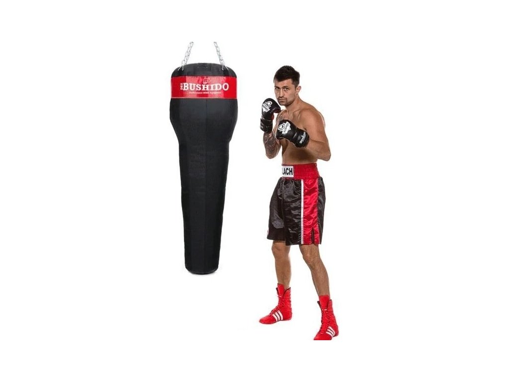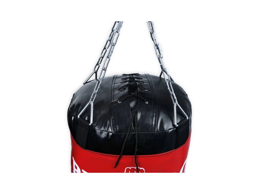 Profesionální boxovací hákový pytel DBX BUSHIDO 140 x 45 až 30 cm. Délka řetezů při zavěšení 45 cm (díky karabině lze nastavit i kratší délku).