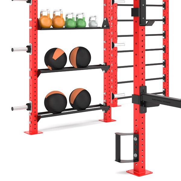Police se připevní ke stojnám pomocí 4 ks dodávaných šroubů. Po dotažení je police ideální pro odkládání míčů (wallbally, medicinbally,...).