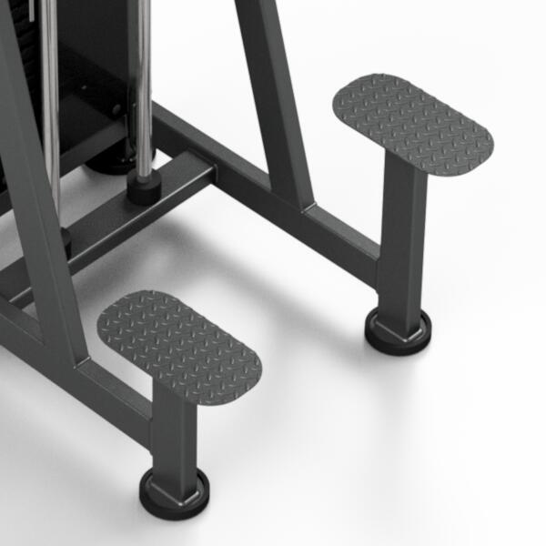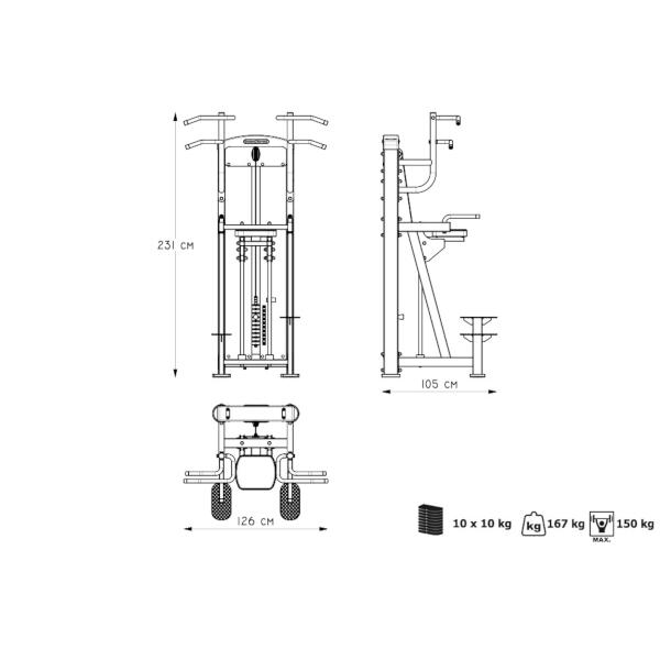 Multifunkční hrazda s dopomocí MARBO MP-U231 je nekompromisní, profesionální vybavení pro Vaší posilovnu. Pro výrobu byly zvoleny ocelové profily 120x60x3mm a 80x40x3mm, které zaručují nečekanou trvanlivost. Zátěž tvoří 10ks 10kg cihel. Celková váha závaží dodávána se strojem je tedy 100kg. Stroj disponuje dvěma nášlapy z drážkovaného plechu o rozměrech 32x17cm a každý je v jiné výšce. Jejich umístění a rozměr minimalizují riziko poranění, ale usnadňují výstup do pracovní pozice. Polstrovaní je ze syntetické kůže sešité režnou nití značky COATS vyplněné tvrdou pěnou, to celé ja na 3mm hrubé, ocelové desce. Tichý chod zajištuje zakrytování černým plastem, z přední části je kryt opatřen průhledem pro snadné nastavení požadovaného počtu cihel. Stroj je navíc opatřen velikou samolepkou, která instruuje cvičence, jaké cviky jdou na stroji provádět a které skupiny svalů daný cvik posiluje.