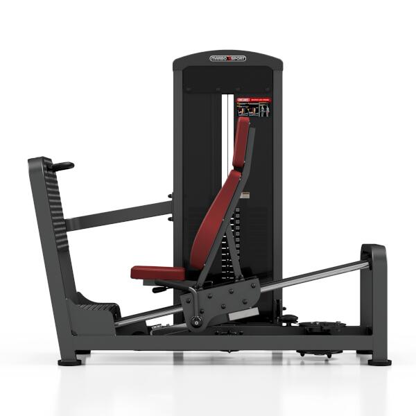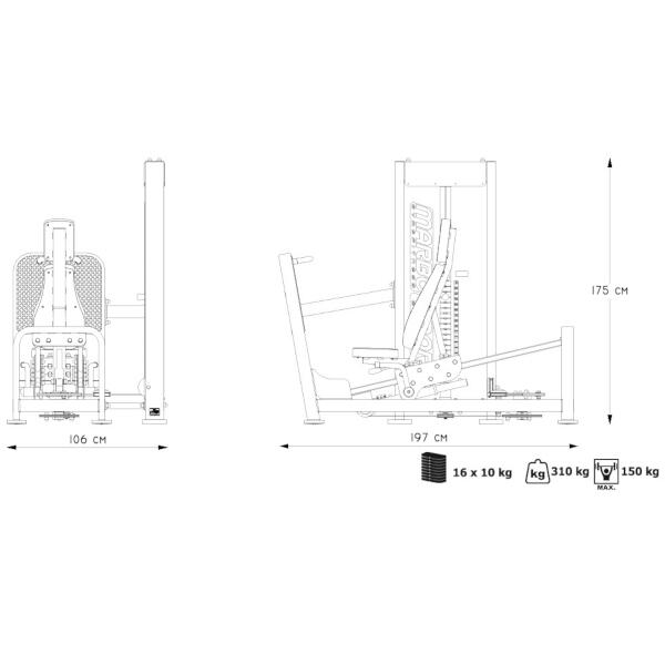 Leg Press MARBO MP-U217 je nekompromisní, profesionální vybavení pro Vaší posilovnu. Pro výrobu byly zvoleny ocelové profily 120x60x3mm a 80x40x3mm, které zaručují nečekanou trvanlivost. Zátěž tvoří 16ks 10kg cihel. Celková váha závaží dodávána se strojem je tedy 160kg. Stroj je vybaven důmyslným systémem regulace startovní pozice sedadla, díky kterému dokážete sjet opravdu nízko a blízko k opěrně desce z drážkovaného plechu. Ta je navic vybavena madlem pro snadné opuštění stroje. Polstrovaní je ze syntetické kůže sešité režnou nití značky COATS vyplněné tvrdou pěnou, to celé ja na 3mm hrubé, ocelové desce. Tichý chod zajištuje zakrytování černým plastem, z přední části je kryt opatřen průhledem pro snadné nastavení požadovaného počtu cihel. Stroj je navíc opatřen velikou samolepkou, která instruuje cvičence, jaké cviky jdou na stroji provádět a které skupiny svalů daný cvik posiluje.