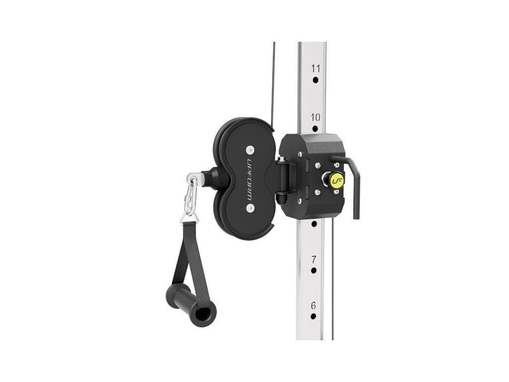 Posuvná kladka UpForm UF-001 je vybavena sadou závaží čítající 12 cihel o celkové hmotnosti 90 kilogramů odstupňovaných po 7,5 kg a jednou doplňkovou cihlou o hmotnosti 3,75 kilogramů, ta se umisťuje nad první pevnou cihlu a používá se k volení hmotnosti od 3,75 kilogramů. Volič váhy je opatřen nálepkami pro rychlou volbu požadované zátěže a jistící čep je připevněn na lanku, takže nehrozí jeho ztráta. Horní rameno se nachází ve výšce 220 centimetrů, na stroji tak může pohodlně trénovat kdokoliv do výšky 200 cm. Veškeré kladky jsou schovány pod kovovými kryty s logem UpForm. Ocelové lanko je pokryto černým PVC, je zakončeno masivním okem a je odpruženo gumovým tlumičem. Posuvný mechanizmus je opatřen madlem pro snadný přesun a pružinovým, jistícím kolíkem. Pojezd lze nastavit do 18-ti poloh, které jsou číslovány.