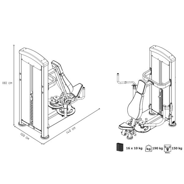 Stroj pro posílení prsních svalů MARBO MP-U227 je nekompromisní, profesionální vybavení pro Vaší posilovnu. Pro výrobu byly zvoleny ocelové profily 120x60x3mm a 80x40x3mm, které zaručují nečekanou trvanlivost. Zátěž tvoří 16ks 10kg cihel. Celková váha závaží dodávána se strojem je tedy 160kg. Ramena mají na sobě nezávislý chod. To zaručuje vysokou efektivitu tréninku. Veškeré nastavení se provádí červenými, pružinovými kolíky. Sedadlo má čtyři polohy, ramena mají pět poloh. Polstrovaní je ze syntetické kůže sešité režnou nití značky COATS vyplněné tvrdou pěnou, to celé ja na 3mm hrubé, ocelové desce. Tichý chod zajištuje zakrytování černým plastem, z přední části je kryt opatřen průhledem pro snadné nastavení požadovaného počtu cihel. Stroj je navíc opatřen velikou samolepkou, která instruuje cvičence, jaké cviky jdou na stroji provádět a které skupiny svalů daný cvik posiluje.