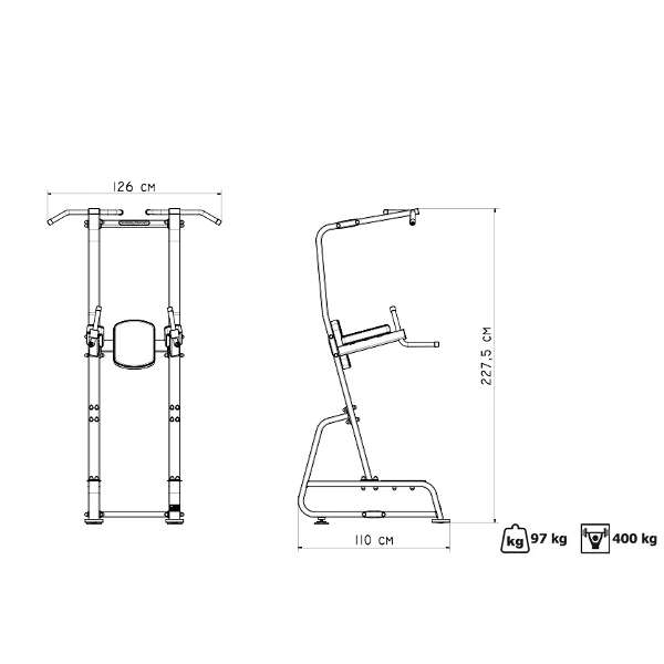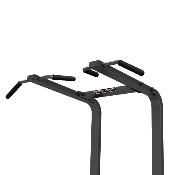 Stacionární stojan s bradly a hrazdami MARBO MP-U210 je produkt ze série Professional, určený jak pro profesionální, tak pro domácí procvičení a posílení téměř celé vrchní poloviny těla. Komfortnímu cvičení napomáhají pěnové úchyty, pohodlné polstrování, nebo nakloněné podpěry rukou. Robustní a stabilní konstrukci zaručuje hmotnost 97 kg a použitý profil 80 x 40 x 3 mm. Horní hrazdy jsou pochromovány a jejich úchopové části jsou opatřeny hrubou, pevnou pěnou pro pocit jistoty během přítahů. Polstrování je vyrobeno z pevné, umělé kůže dvojitě prošité pevnou nití značky Coats. Oporu zajištuje 3 mm hrubá ocelová deska. Nášlapy jsou vyrobeny z vroubkované, masivní ocelové desky.