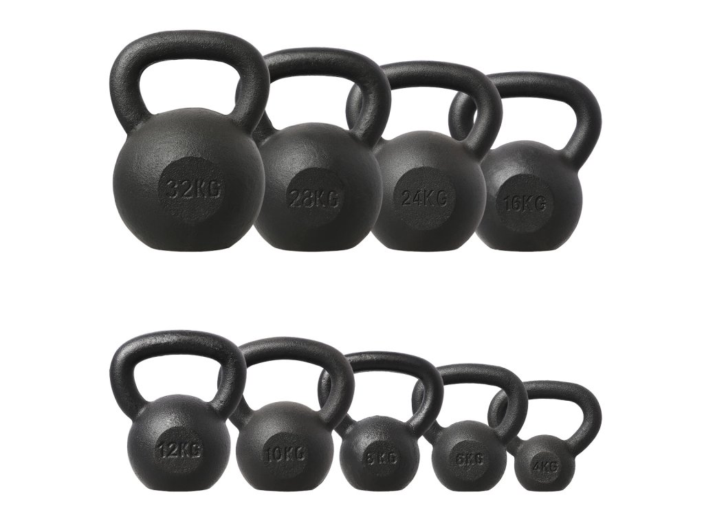 Materiál a zpracování ve tvaru zvonu s trojúhelníkovým úchopem, ploché dno zajišťuje vysokou stabilitu. Široký rozsah hmotnosti (4 - 32 kg) umožňuje přesný výběr zatížení.
