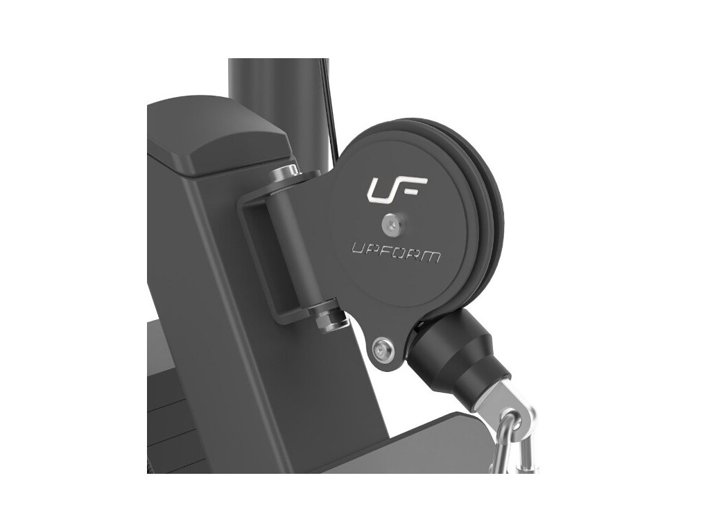 Spodní kladka s lavicí UpForm UF-004 je vybavena sadou závaží čítající 16 cihel o celkové hmotnosti 120 kilogramů odstupňovaných po 7,5 kg. Volič váhy je opatřen nálepkami pro rychlou volbu požadované zátěže a jistící čep je připevněn na lanku, takže nehrozí jeho ztráta. Stanice je opatřena robustními, kovovými opěrami pro nohy, které jsou navíc vybaveny gumovými výstupky. Na samotnou lavici bylo použito perforované čalounění, které zajišťuje dostatečnou ventilaci a odvod vlhkosti. Veškeré kladky jsou schovány pod kovovými kryty s logem UpForm. Poslední kladka je na otočném kloubu, který zvyšuje rozsah použití stanice, při vytočení kladky do strany můžete UF-004 používat i jako klasickou spodní kladku. Ocelové lanko je pokryto černým PVC, je zakončeno masivním okem a je odpruženo gumovým tlumičem.