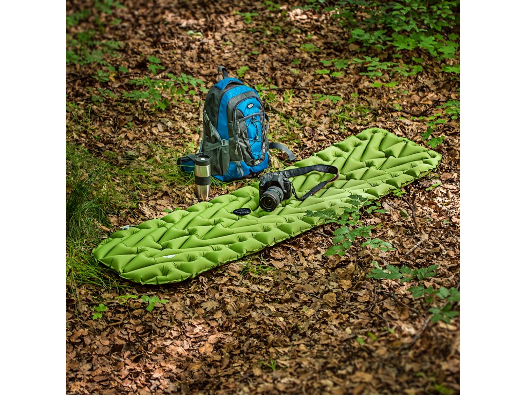 Ve složeném stavu zabírá podložka velmi málo místa a její skládání je velmi jednoduché. Stačí odšroubovat ventil a karimatku srolovat od horního okraje. Nemusíte se bát, že se sama rozbalí, protože má popruh, který podložku po srolování zajistí. V sadě je navíc praktické pouzdro, do kterého můžeme karimatku zabalit. Usnadní vám přepravu a navíc chrání podložku před poškozením. Díky své velikosti a hmotnosti jen 0,6 kg ji můžete mít snadno u sebe na každé cestě.