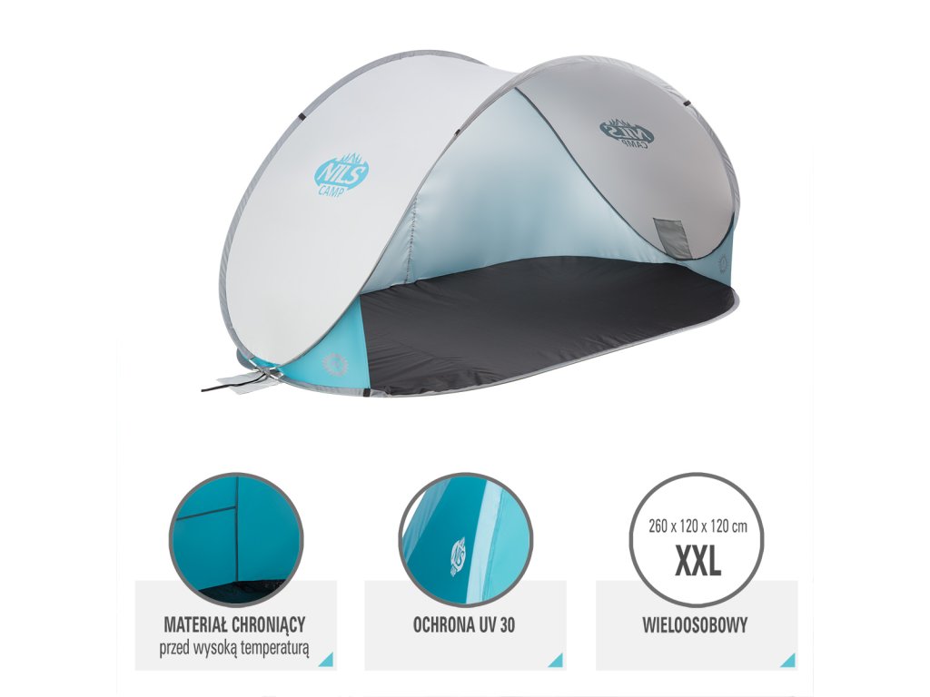 Plážový stan NILS Camp NC3174 využijete nejen během dovolené u moře, ale také na veřejném koupališti, nebo u bazénu na zahradě. Hlavní funkcí plážového stanu je ochrana před slunečními paprsky a škodlivým UV zářením. Model NC3174 odrazí až 96% UV záření. Stan je dodáván složený v kruhové tašce opatřené uchem pro snadné přenášení. Po vytažení z tašky se stan automaticky rozloží. Pro složení se použije jednoduché gesto a stan se schová opět do tašky. Podlaha o rozměrech 120 x 220 cm a výška 100 cm umožňují úkryt před sluncem jak dětem, tak rodičům. Podpůrná konstrukce přístřešku je tvořena sklo-laminátovou tyčí. Na ni je navlečena polyesterová plachta. Použitý materiál odolá i malé, dešťové přeháňce.