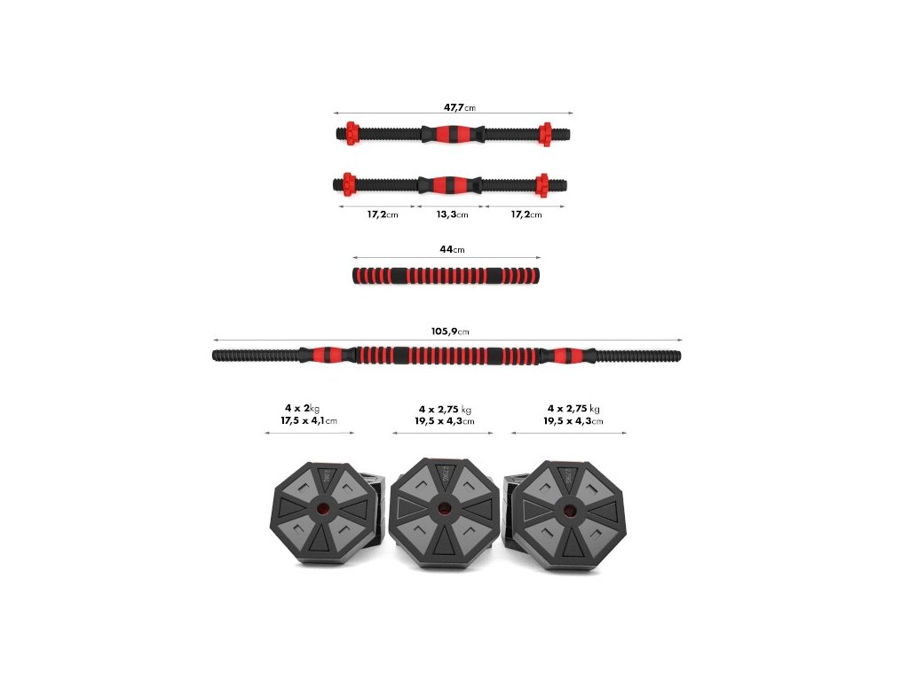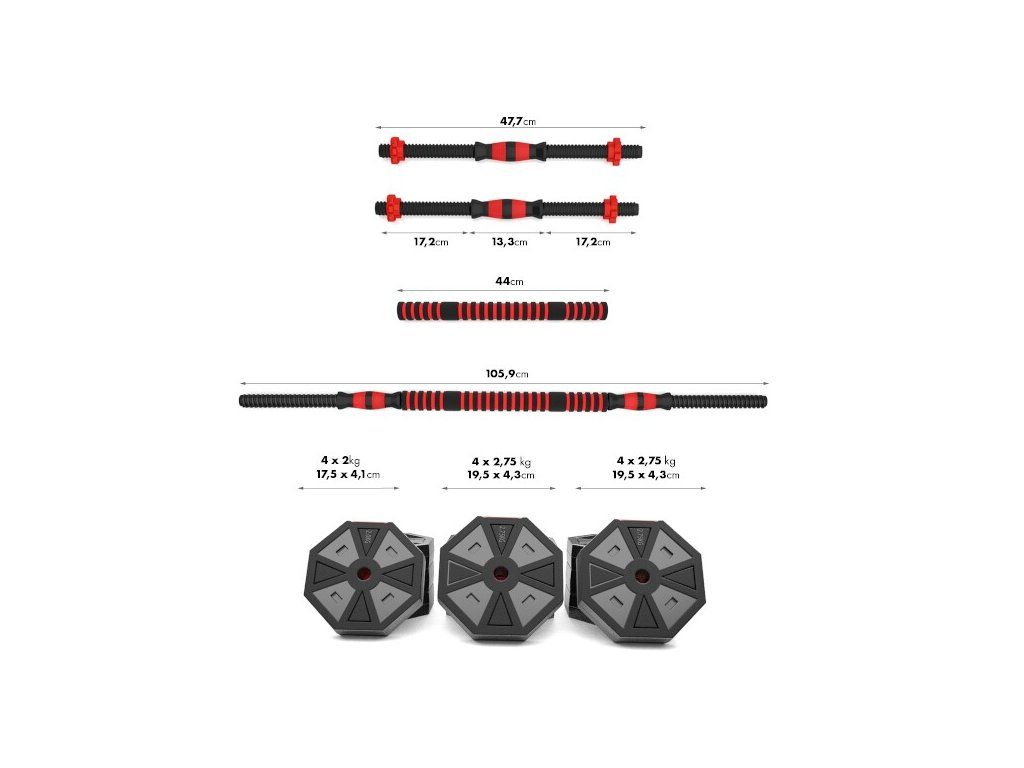 Sada obsahuje 1 spojovací díl, 2 jednoruční hřídele, 4 hvězdicové matice a celkem 12 kotoučů různých vah.