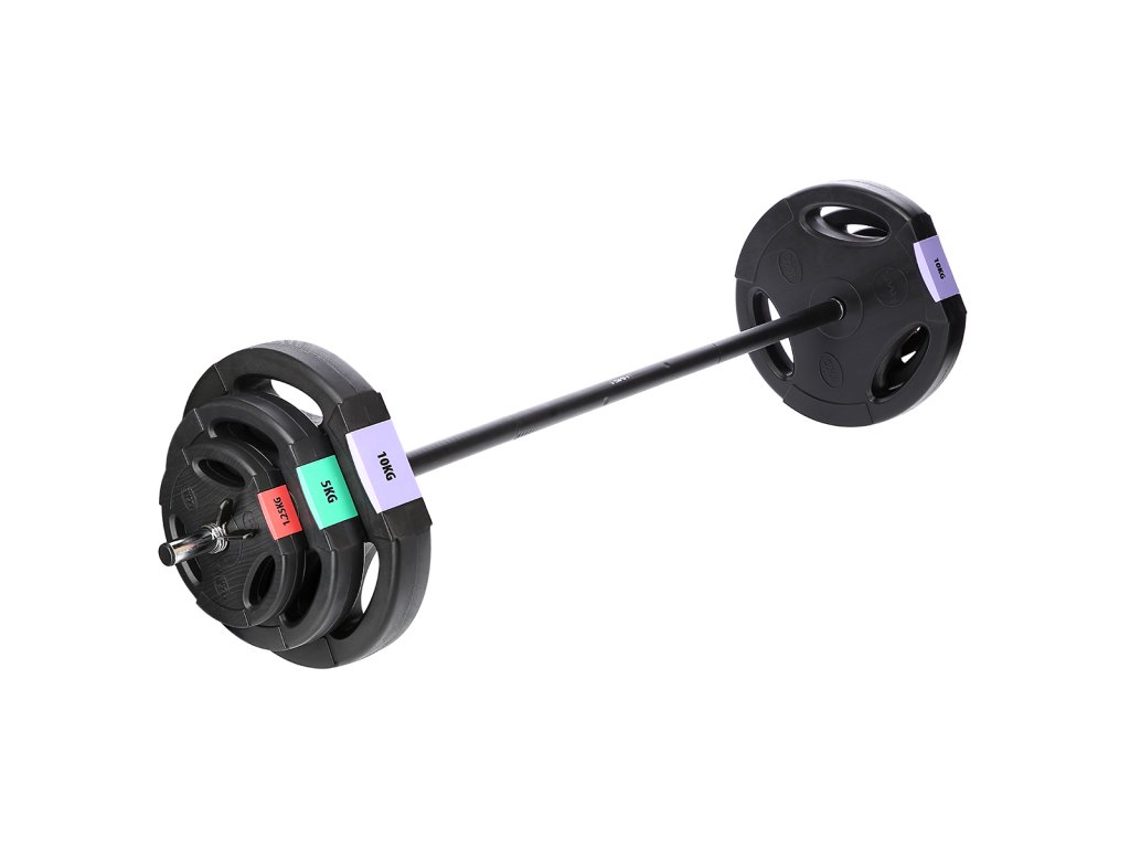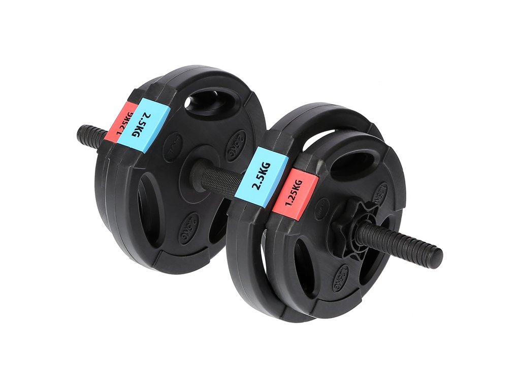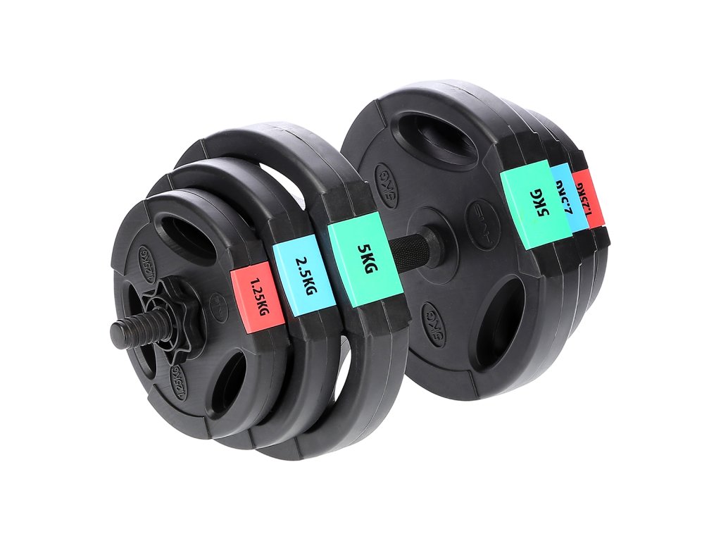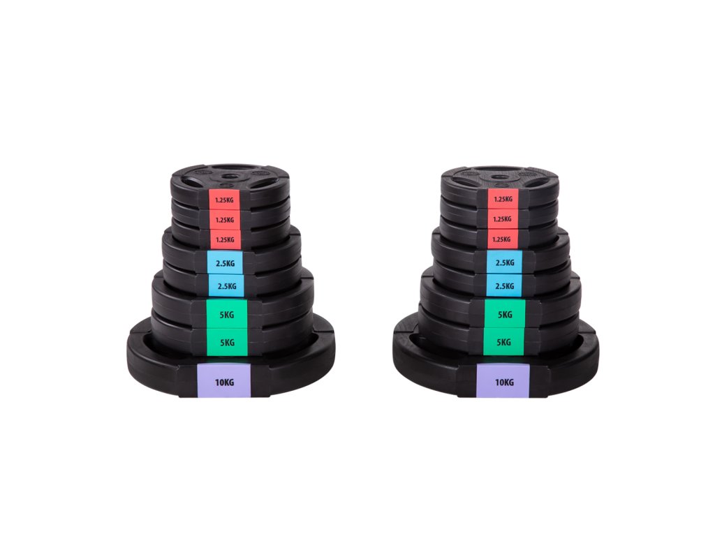Kotouče jsou vyrobeny z trvdého plastu, který je vyplněn cementem. Obouruční osa je tvořena ze tří částí, které se do sebe skládají pomocí šroubení. Nakládací trny jsou hladké a závaží se zajišťuje pružinovými svorkami. Trny jednoručních činek jsou opatřeny závitem a závaží je jištěno hvězdicovými maticemi.