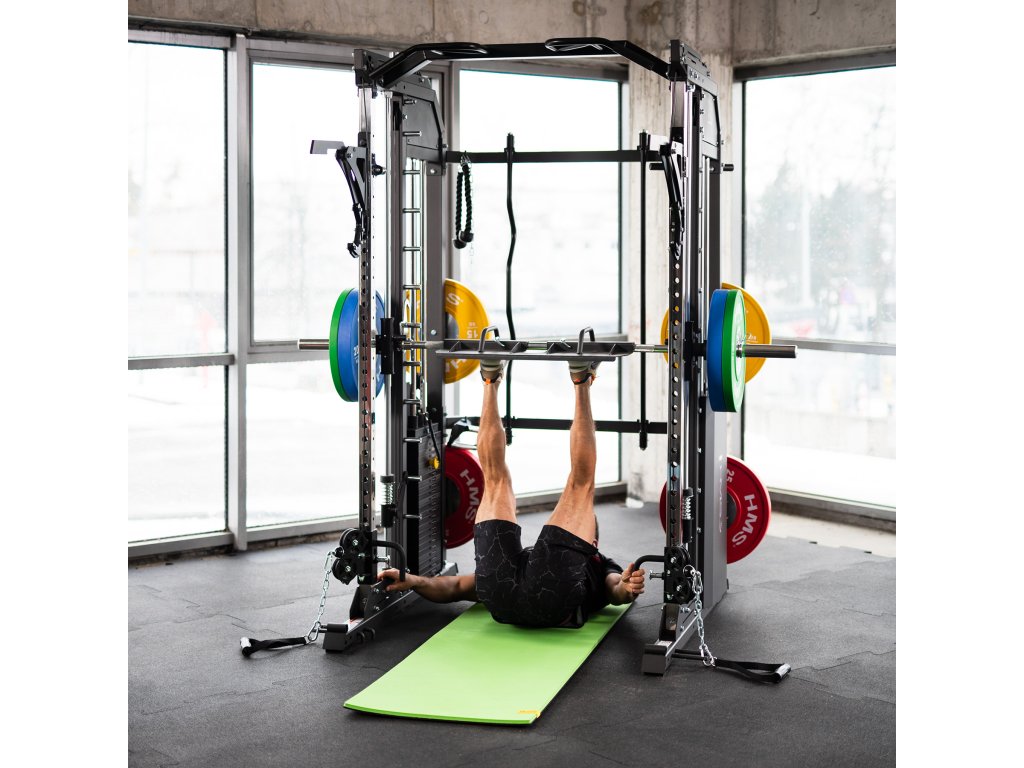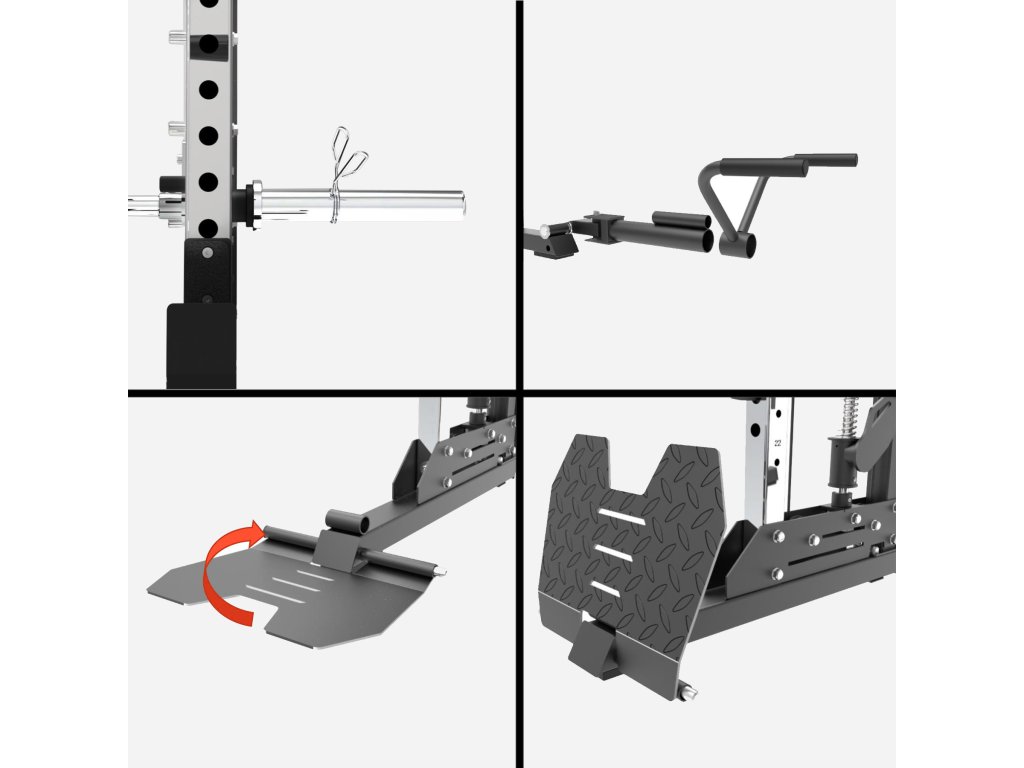 - Multipress - pohyblivá nakládací osa umístěna na vodících tyčích pro bezpečný trénink dřepů, benchpressu a dalších cviků s obouruční činkou ať už s lavičkou, nebo bez ni. Pohyblivá pouzdra jsou opatřena lineárními ložisky pro hladký chod. Výškově nastavitelné dorazy s robustní pružinou nastavitelné do 9 úrovní.