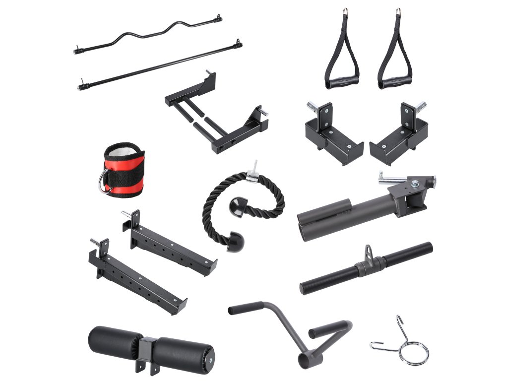 - Adaptéry ke kladkám - 2 jednoruční úchopy, rovná obouruční osa, lomená obouruční osa, popruh na kotník, tricepsové lano, veslovací adaptér a rovný tricepsový adaptér.