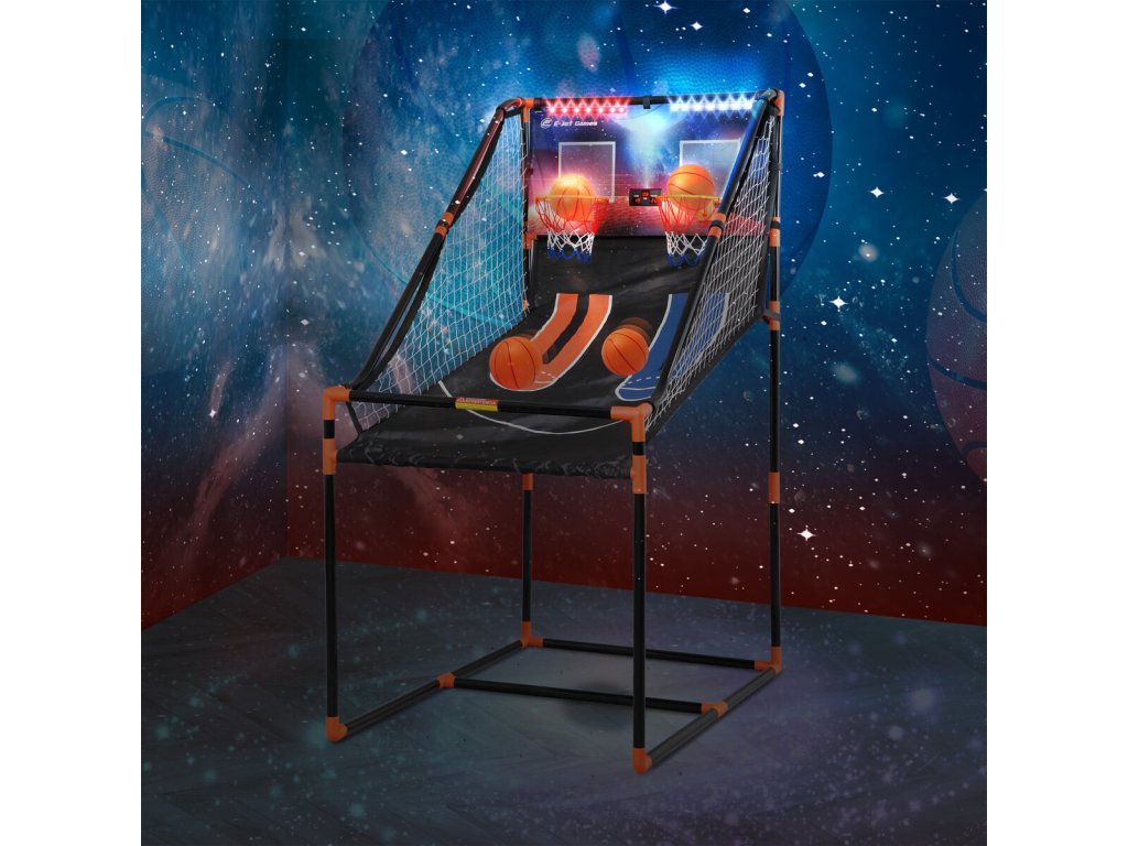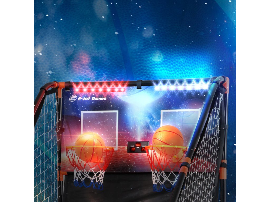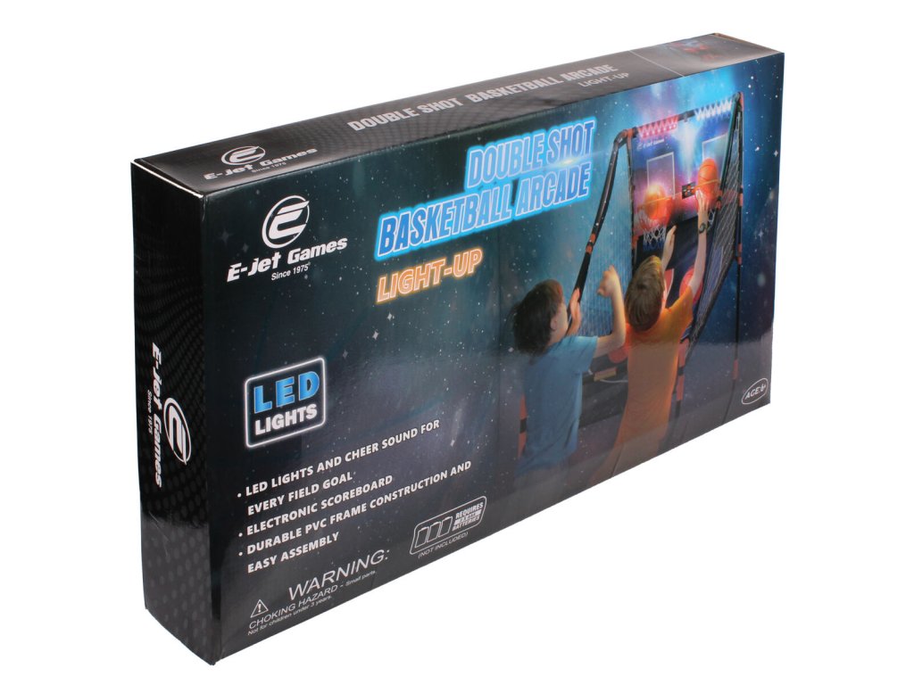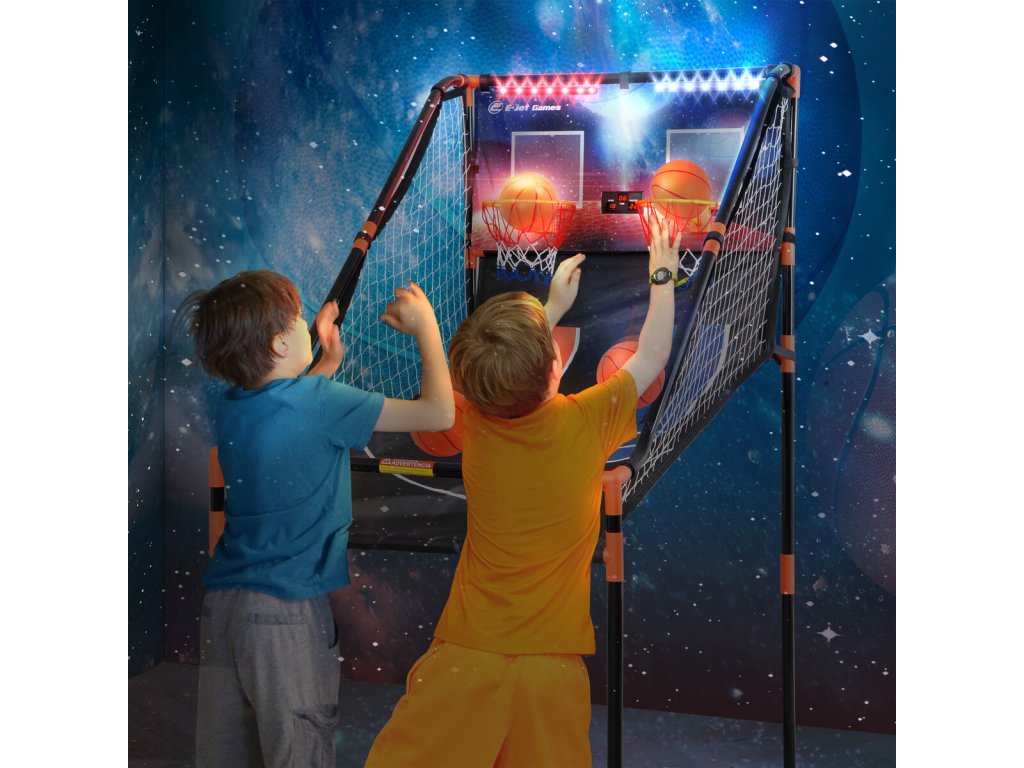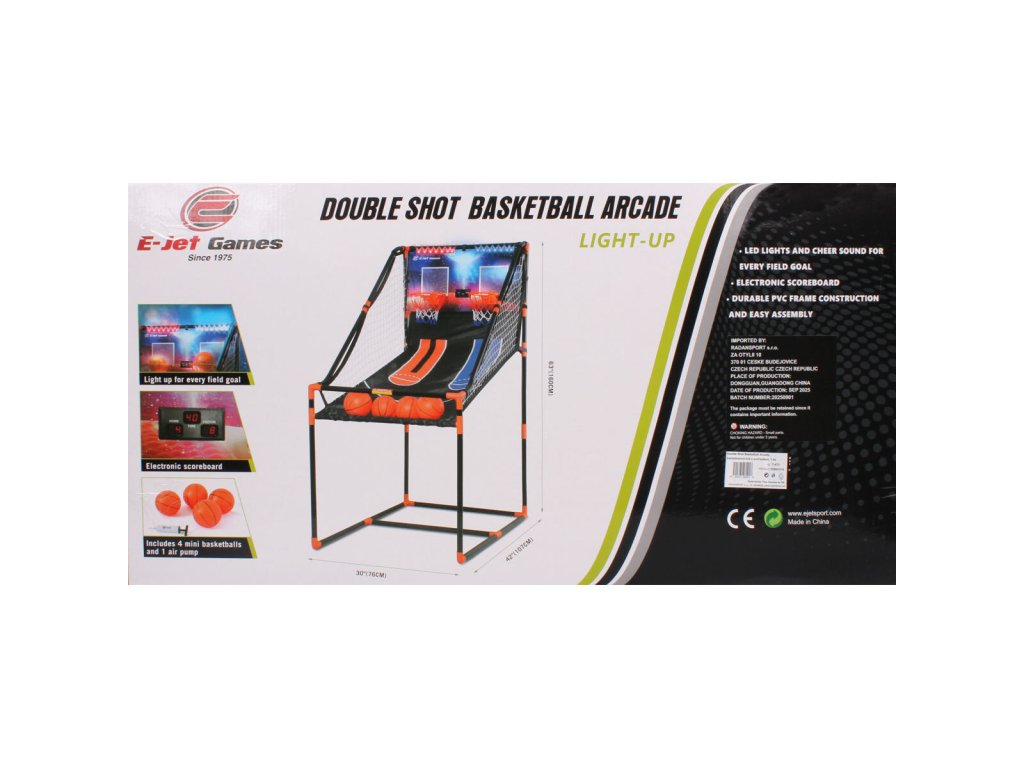 Vytvořte dětem a celé rodině zábavný zážitek s basketbalovou hrou pro dva hráče E-Jet Games Double Shot Basketball Arcade. Tato basketbalová deska je vybavena LED světly a zvukovým efektem, který vám i vašemu soupeři pomůže oslavit každý vstřelený koš. Konstrukce se dvěma koši je ideální pro soupeření s přáteli a rodinou a hra má elektronickou výsledkovou tabuli s dvojitým displejem pro přehled dosavadního vítěze. Rám této snadno sestavitelné arkády je vyroben z odolného PVC. Deska vyžaduje 3x AAA baterii, které nejsou součástí balení. - rozměry po sestavení: 76 cm x 107 cm x 160 cm - součástí 4 gumové míčky s průměrem 10 cm, ruční pumpička s jehlou - LED světla a povzbuzující zvuk pro každý vstřelený koš - elektronická výsledková tabule s dvojitým displejem - odolná konstrukce z PVC rámu a snadná montáž - napájení: 3 x AAA baterie (nejsou součástí balení) - hmotnost balení: cca 4,4 kg - rozměry balení: 75 x 40 x 11 cm Výrobek není vhodný pro děti do 6 let! Vždy používejte pod dohledem dospělé osoby.Doplňkové parametry