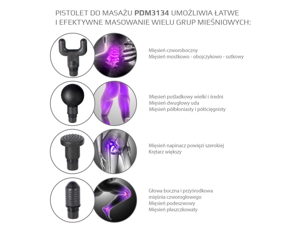 Masážní pistole HMS PDM3134I je ideálním nástrojem pro hloubkovou masáž svalů celého těla. Tento masážní přístroj najde uplatnění jak u sportovců, tak u lidí se sedavým životním stylem, nebo například u fyzioterapeutů. PDM3134I obdržíte v elegantním kufříku černé barvy spolu se čtyřmi nástavci, napájecím adaptérem a návodem k použití.