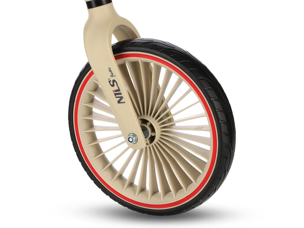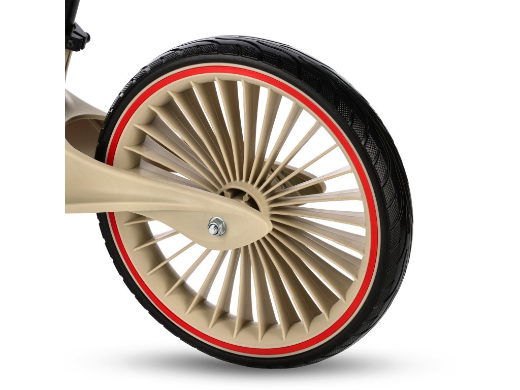 Tento model je vybaven 12" koly z odolného PU, která tlumí nerovnosti a zajišťují hladkou jízdu. Díky tomu je kolo vhodné na chodníky, cyklostezky i travnaté cesty v parku.