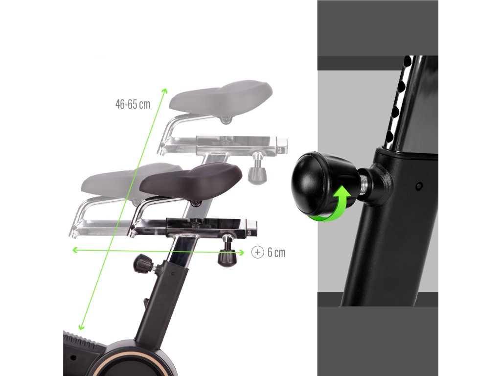 Air Bike MP5458 umožňuje nastavit sedlo tak, aby vyhovovalo vaší výšce a preferencím. Sedlo můžete ručně nastavit vertikálně i horizontálně, takže si můžete najít optimální polohu pro svůj trénink. Sedlo je pohodlné a ergonomické. Bylo potaženo syntetickou kůží pro větší odolnost a snadné čištění.