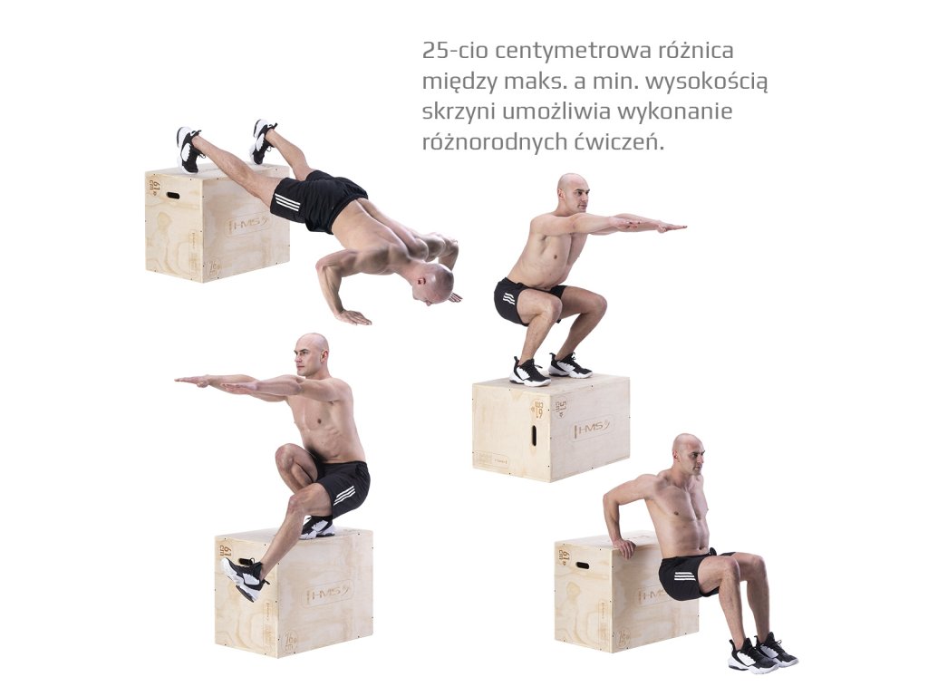 Plyometrický box HMS DSC01 je bedna určena pro kondiční trénink. Box je nedílnou součástí každého fitness centra, pomůckou profesionálních sportovců nebo i atletů. Vyroben je z 18 mm překližky a má klasické rozměry 76,2 x 60,96 x 50,8 cm (30 x 24 x 20 palců).