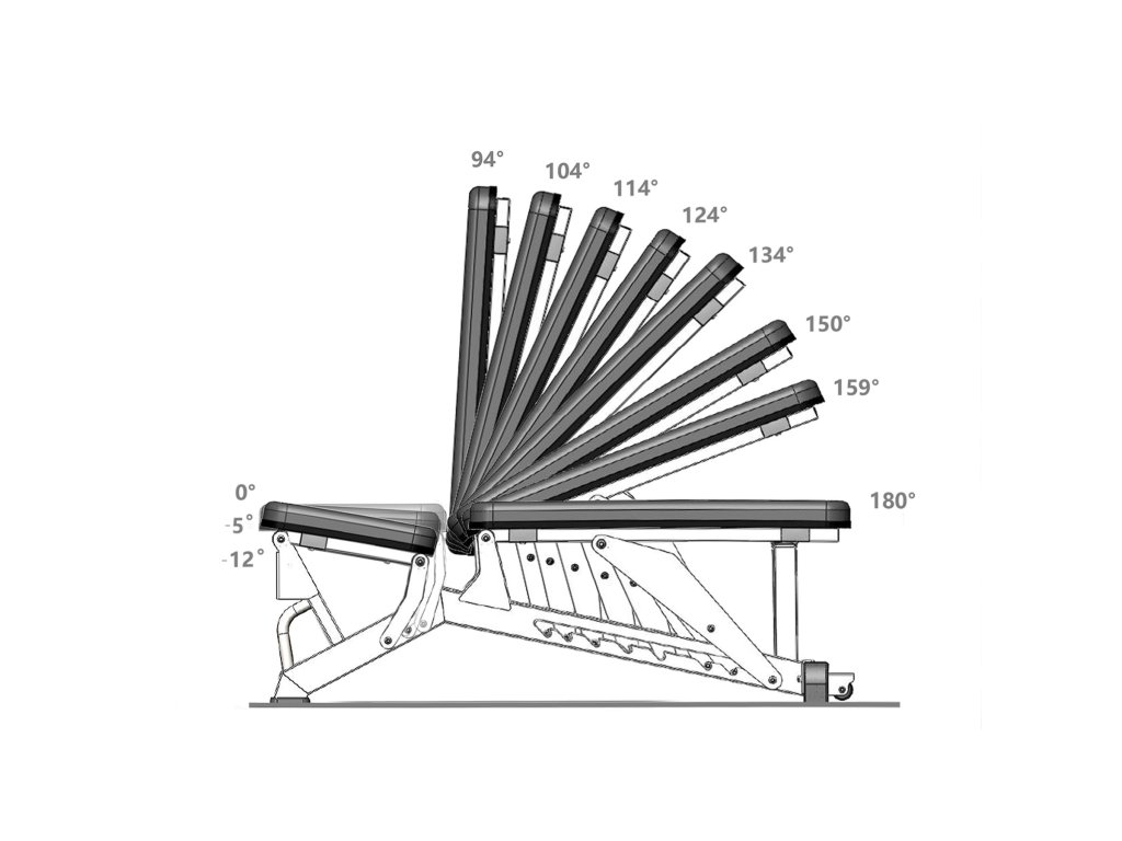 Lavice L1237 nabízí 3 úrovně nastavení sedáku a 8 úrovní nastavení opěradla. Rozsah úhlu opěradla je od 94° do 180°, což umožňuje trénink v různých polohách – svislé, vodorovné i šikmé. Díky tomu můžete efektivně procvičit různé svalové partie, od hrudníku přes záda až po ramena, a přitom si zachovat maximální pohodlí.