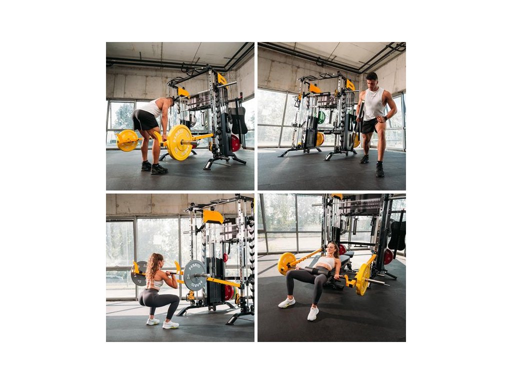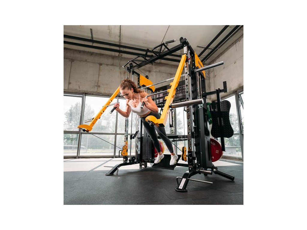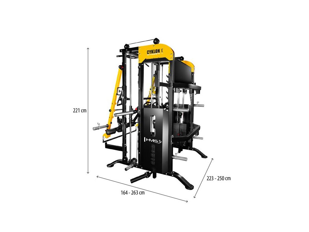HMS Cyklon X je revoluční tréninkový posilovací stroj, který umožňuje komplexní trénink všech svalových skupin bez nutnosti měnit vybavení. Toto jediné zařízení nahradí celou posilovnu a zajistí nejvyšší kvalitu a nekonečné možnosti tréninku. Nabízí minimálně devět základních variant výběru tréninku - pohyblivá ramena, čepy pro trénink s odporovou gumou, posuvné protisměrné kladky, multipress, legpress, hrazda, podpěry na kliky, zarážka na sedy-lehy a landmine (víceosý kloub). Jako zátěž lze použít vestavěnou sadu závaží a nebo olympijské kotouče.