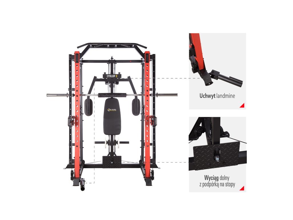 CYKLOP 3 je kombinací multipressu, hrazdy, motýlka, stojanu na osu a dvou posuvných kladek. Spojením všech prvků do jednoho celku získáme univerzální zařízení, které umožňuje trénovat všechny svalové skupiny. Efektivitu tréninku a jeho možnosti zvýší přiložené příslušenství v podobě adaptérů ke kladkám (dvojité tricepsové lano, úzký, lomený adaptér, popruh na kotník a nylonové popruhy s madlem), výškové nastavitelné DIP adpatéry, háky pro odložení osy a multiosý kloub (takzvaný landmine). Hlavní osa je opatřena pěnovým návlekem pro maximální pohodlí během tréninku dřepů. Dorazy multipressu jsou tvořeny pružinami, které pohltí většinu energie při nouzovém upuštění osy.