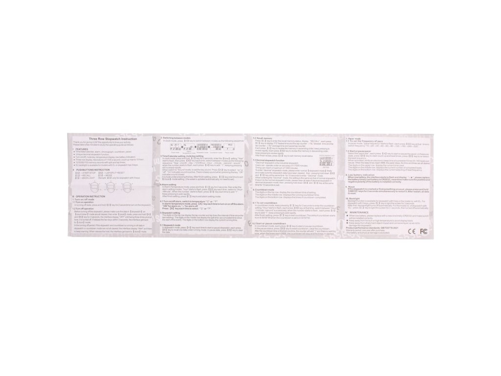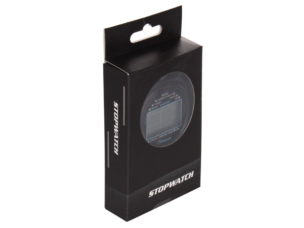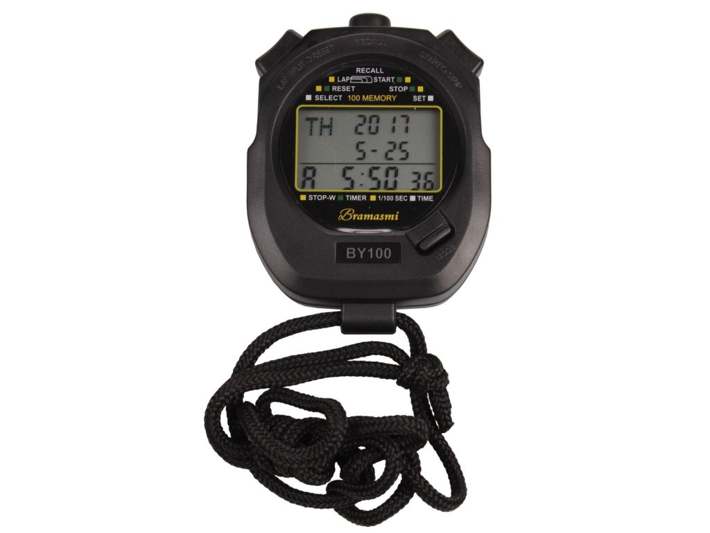 Kvalitní sportovní stopky Bramasmi BY100 se 100 mezičasy jsou praktickou pomůckou pro odměřování kratších časových intervalů. Využití najdou v celé řadě sportů, jako například běh, plavání, cyklistika, atletika, apod. Stopky BY100 jsou vhodné jak pro trenéry sportovců, tak pro učitele tělesné výchovy i sportovní kroužky. Funkce: - Čas, datum, budík, chronograf, odpočítávání; - Funkce desetinných stopek, režim tempa; - Zapnutí/vypnutí, tlačítko ztlumení, zobrazení teploty, indikace slabé baterie; - Třířádkový displej, rozlišení 1/100 za sekundu, počítání max. do 10 hodin; - 100 paměťových záznamů s mezičasy a časy kol.Doplňkové parametry