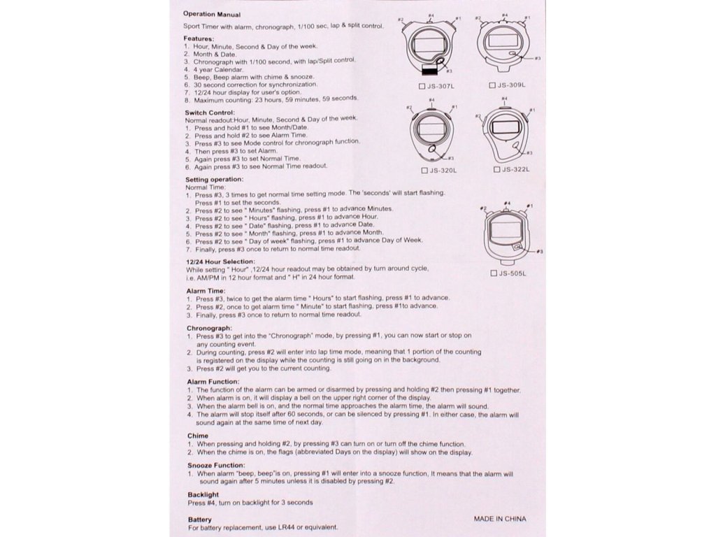Sportovní stopky JUNSD JS-322L jsou díky své nízké ceně a jednoduchému ovládání vhodné pro každého trenéra, školy, sportovní oddíly nebo sportovce, kteří chtějí mít přehled o časech svých výkonů. Oproti klasickému modelu JS-322 nabízí navíc praktickou funkci podsvícení displeje. Součástí balení je i šňůrka na krk. Funkce: - hodiny, minuty, sekundy & dny v týdnu - datum - stopky s přesností 1/100 sekundy - alarm - 30 sekundová korekce pro synchronizaci - 12/24 hodinový displej - maximální počet: 23h 59min 59sek - podsvícení displejeDoplňkové parametry
