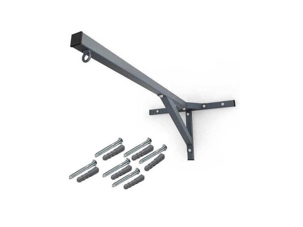 Nástěnný držák na boxovací pytel do 150 kg.Boxovací pytel nevyužijete, pokud ho není na co pověsit. Nástěnný držák vám umožní vytvořit boxovací stanici kdekoli ve vašem domě nebo v tělocvičně. Vzdálenost háku od stěny je 101 cm, takže boxovací pytel nenarazí na žádné překážky a vrátí se do výchozí polohy přirozeným způsobem. Rám je upevněn na 6 odolných hmoždinkách a diagonální konzole dodávají konstrukci maximální tuhost - velmi důležitá vlastnost, která zajišťuje efektivní trénink boxu.