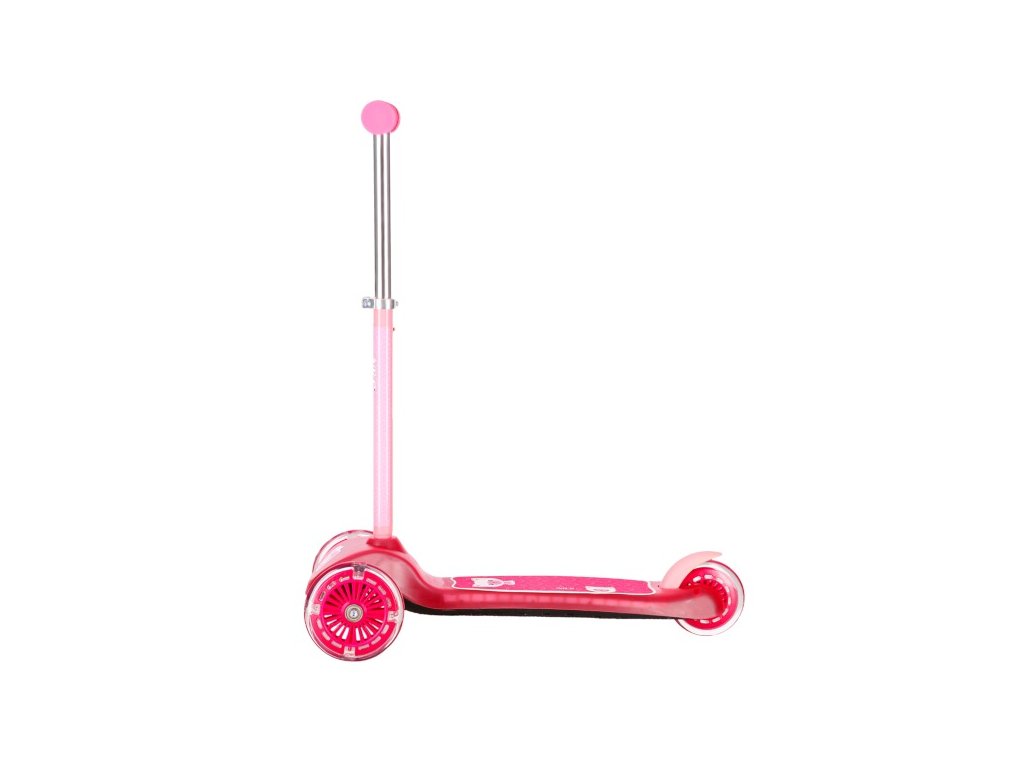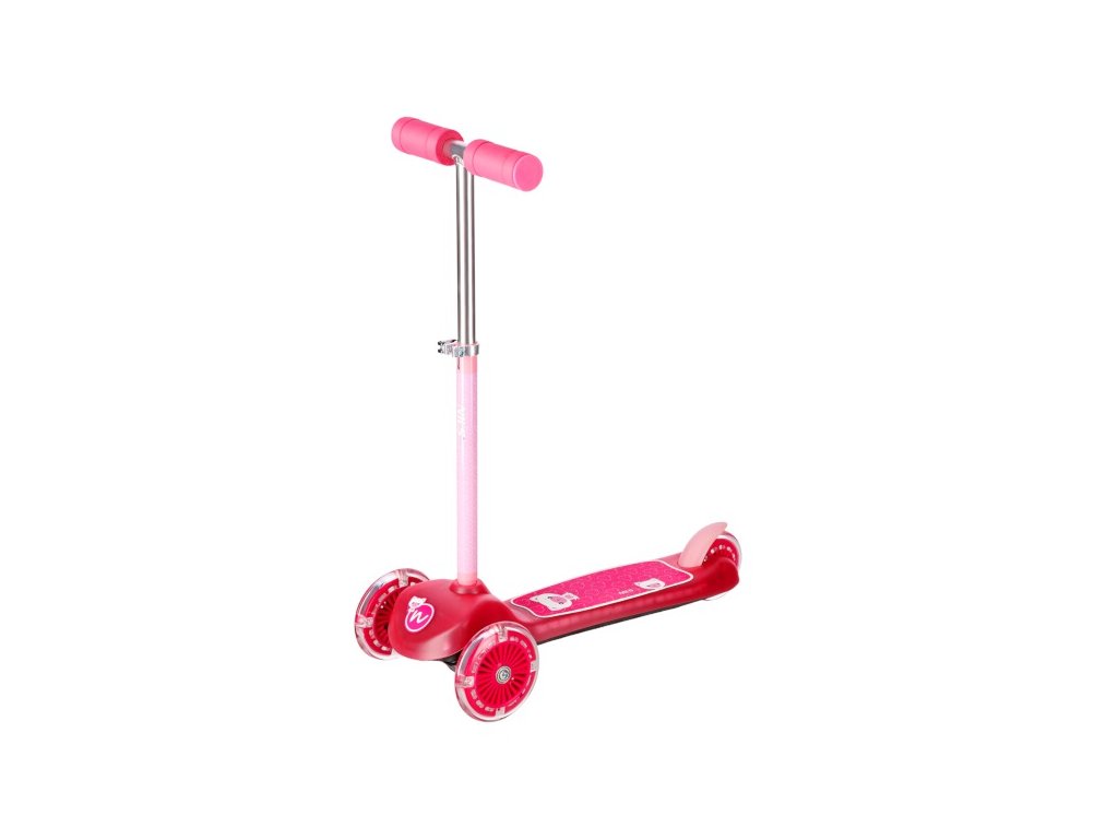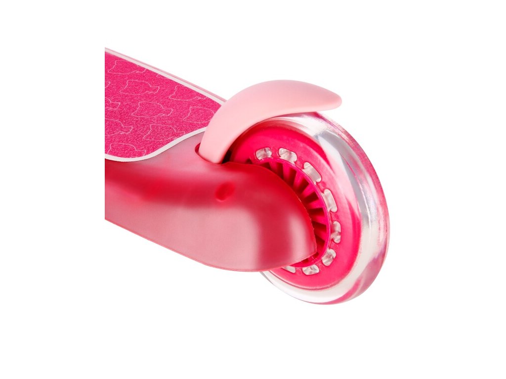 Přední kolečka o průměru 125 milimetrů a zadní kolečko o průměru 100 milimetrů jsou osazeny barevnými LED diodami. Svítící LED diody slouží jako zajímavý, vizuální prvek, zvyšují zájem dětí a v neposlední řadě zvyšují viditelnost koloběžky například za šera. Kolečka svítí automaticky během jejich otáčení. Dále jsou kolečka osazeny ložisky ABEC 5 pro pohodovou jízdu. Zadní blatník slouží jako nášlapná brzda pro bezpečné zastavení koloběžky.