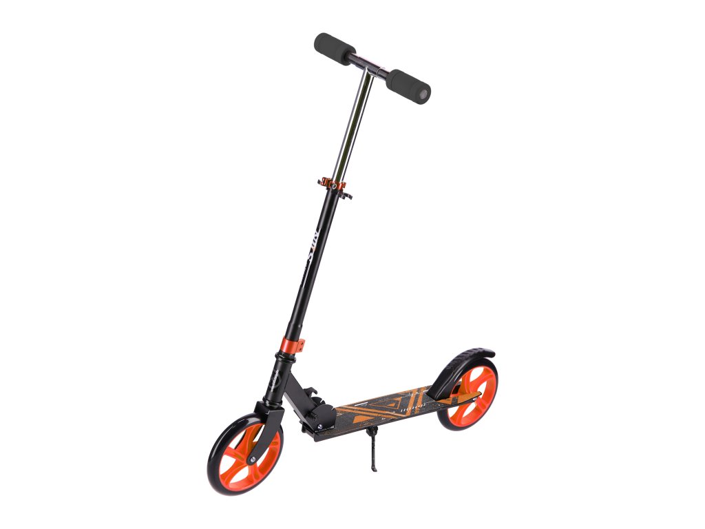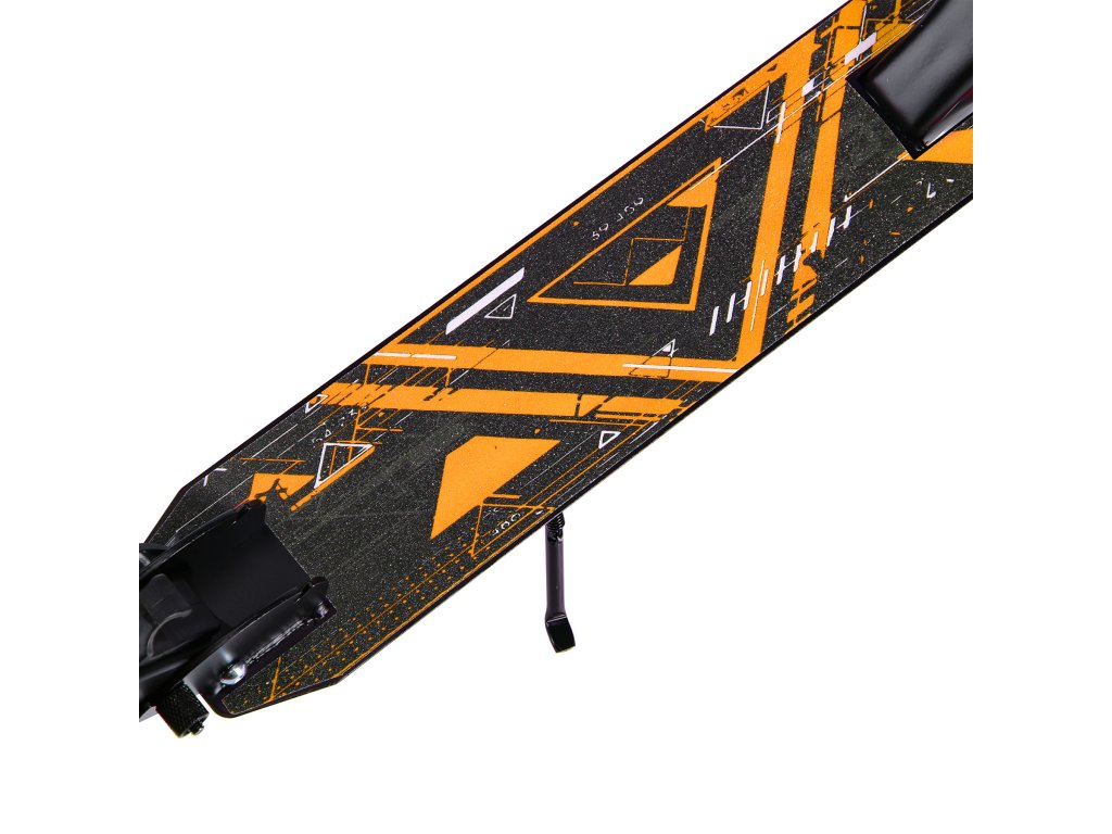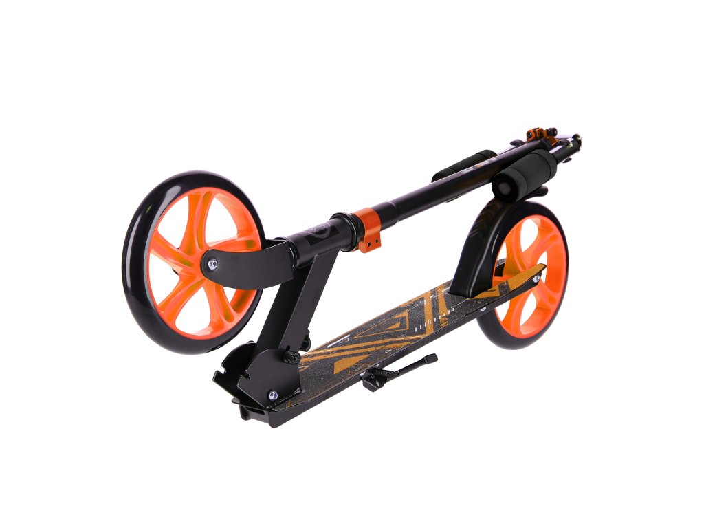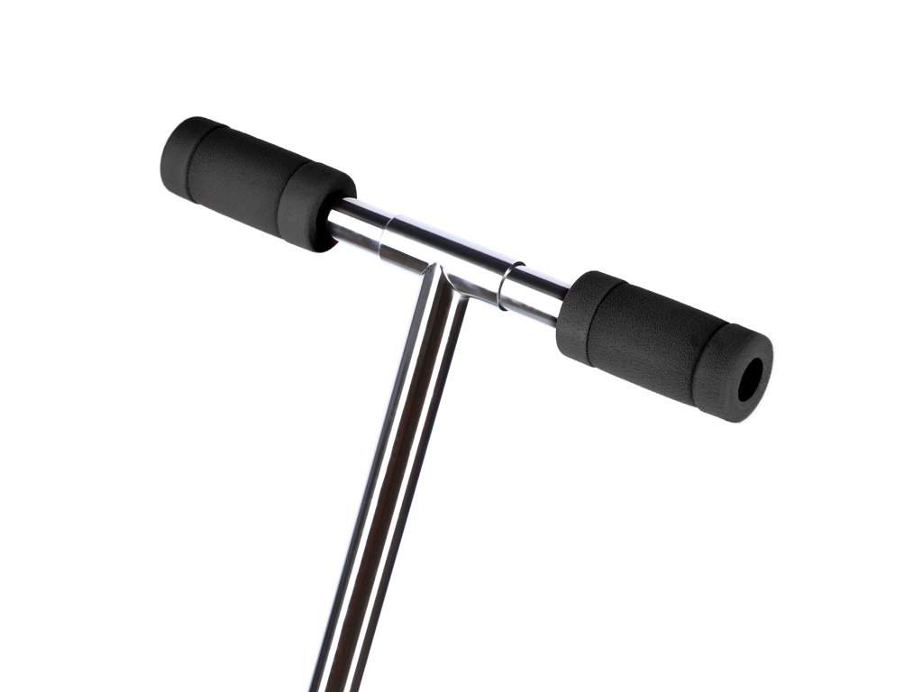 Zadní blatník slouží jako přítlačná brzda. Rídítka je možné při skládání sklopit a pro maximální pohodlí během jízdy jsou opatřena gumovými rukojeťmi. Výšku řídítek lze nastavit do 3 úrovní v rozsahu od 79 do 103 cm.