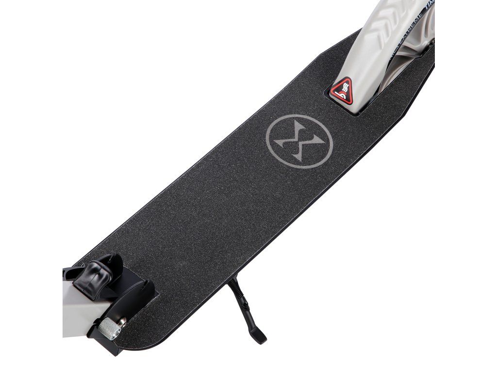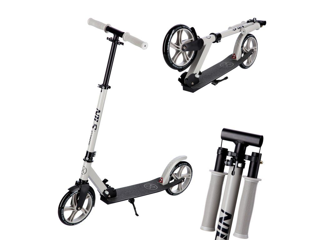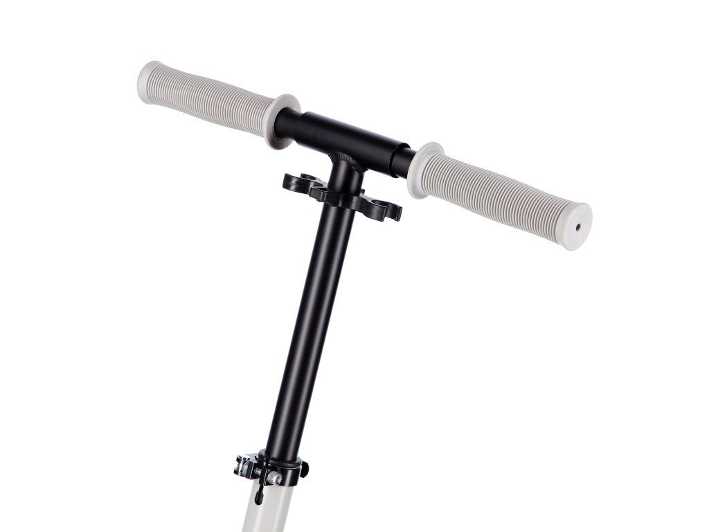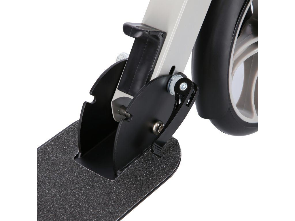 Zadní blatník slouží jako přítlačná brzda. Rídítka je možné při skládání sklopit a pro maximální pohodlí během jízdy jsou opatřena gumovými rukojeťmi. Výšku řídítek lze nastavit do 3 úrovní v rozsahu od 75 do 95 cm.