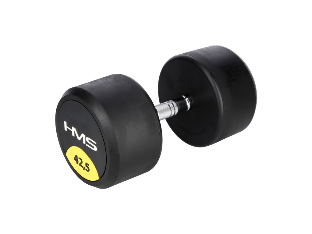42,5 kilogramová jednoruční činka HMS HG Pro je určená pro profesionální použití jak doma tak v posilovně. Závaží tvoří litinový odlitek pokrytý silnou vrstvou gumy, která ochrání jak činku, tak podklad před poškozením. Na čelní straně je značka HMS a údaj o hmotnosti v kilogramech. Rukojeť je vyrobena z chromované oceli, pro pohodlný úchop má soudkovitý tvar s vroubkovaným povrchem.