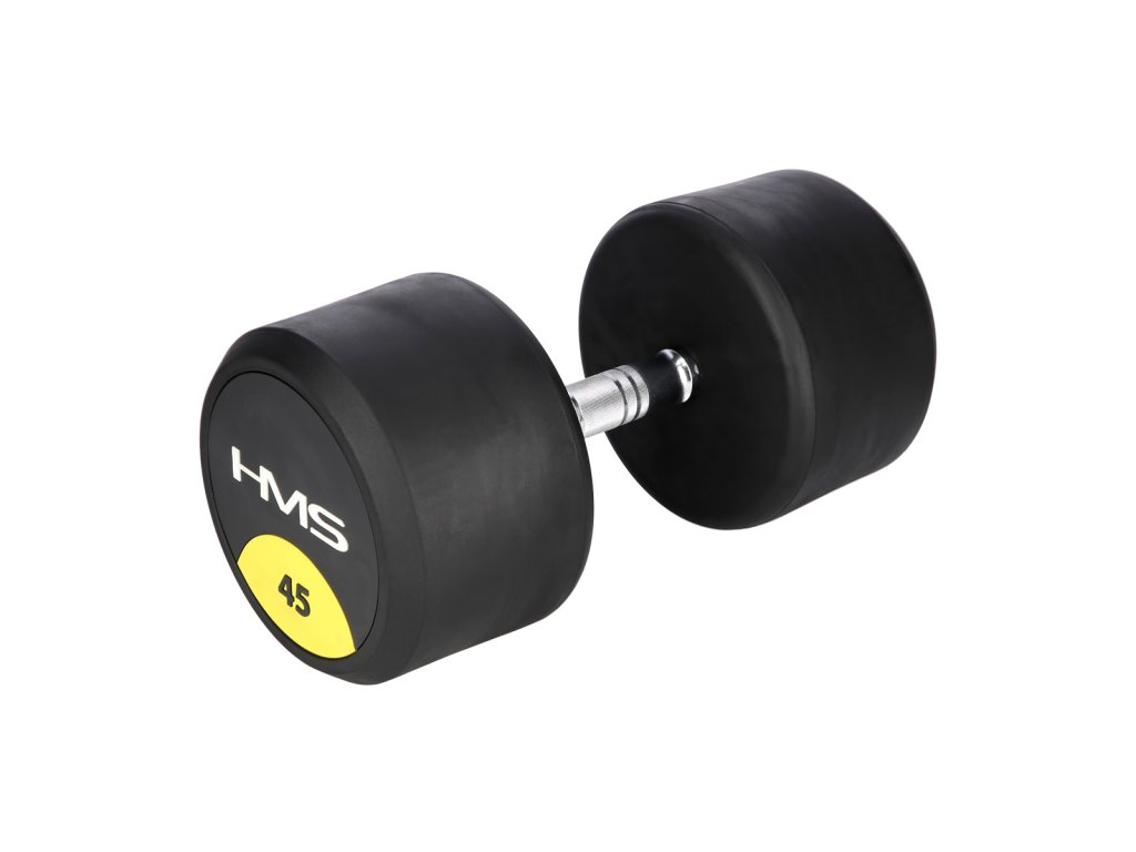45-ti kilogramová jednoruční činka HMS HG Pro je určená pro profesionální použití jak doma tak v posilovně. Závaží tvoří litinový odlitek pokrytý silnou vrstvou gumy, která ochrání jak činku, tak podklad před poškozením. Na čelní straně je značka HMS a údaj o hmotnosti v kilogramech. Rukojeť je vyrobena z chromované oceli, pro pohodlný úchop má soudkovitý tvar s vroubkovaným povrchem.