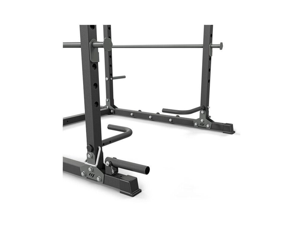 Součástí klece jsou boční bezpečnostní tyče, které slouží jako pojistka při dřepech nebo bench pressu. V případě selhání série lze činku bezpečně odložit bez rizika zranění.