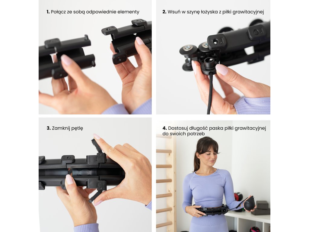 Délka obruče se nastaví podle obvodu pasu tak, aby byla dostatečně volná, ale zároveň aby nepadala přes boky. Po nastavení délky se obruč uzamkne pomocí spojovacího dílu, který je osazen páčkami pro ovládání zámku. Závaží se následně "vrhne" směrem, do kterého budeme kroutit boky a začneme trénink. Obruč HHW12 je z vnitřní strany opatřena masážními kloboučky s pružinami, které tlumí vibrace od pohybující se kotvy a zároveň příjemně masírují oblast pasu. Intensitu tréninku ovlivňuje délka provázku a rychlost, jakou kroutíme boky.
