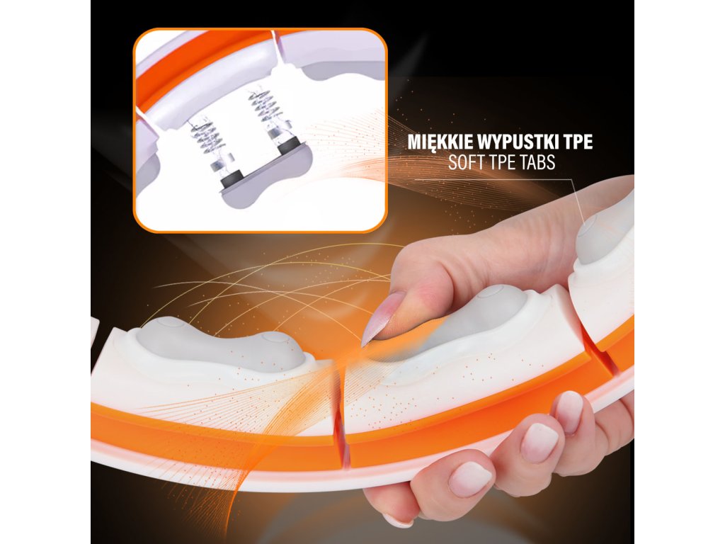 Hula hoop je vybaven masážními výstupky vyrobenými z termoplastického elastomeru (TPE), díky čemuž je používání mimořádně pohodlné. Materiál TPE je známý svou pružností, odolností a hypoalergenními vlastnostmi. Díky tomu výstupky nejen zlepšují přilnavost a stabilitu při tréninku, ale také jemně masírují tělo.