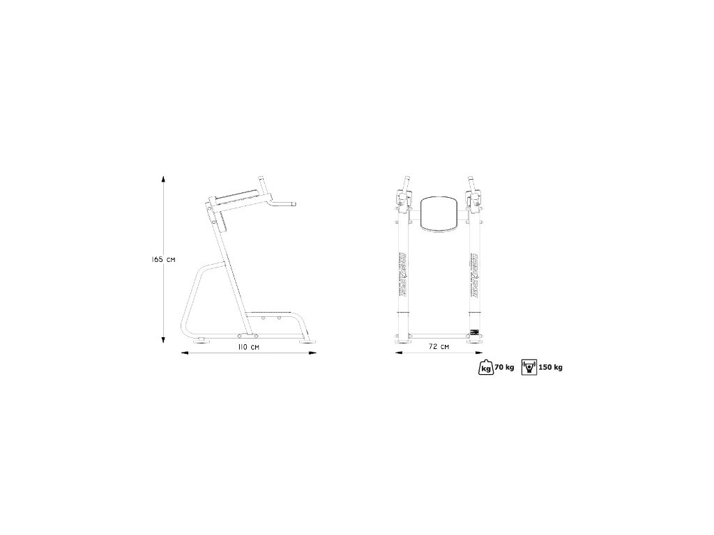 Stacionární stojan s bradly MARBO MP-U202 je produkt ze série Professional, určený jak pro profesionální, tak pro domácí procvičení a posílení břišních svalů. Komfortnímu cvičení napomáhají pěnové úchyty, pohodlné polstrování, nebo nakloněné podpěry rukou. Robustní a stabilní konstrukci zaručuje hmotnost 70 kg a použitý profil 80 x 40 x 3 mm. Polstrování je vyrobeno z pevné, umělé kůže dvojitě prošité pevnou nití značky Coats. Oporu zajištuje 3 mm hrubá ocelová deska. Nášlapy jsou vyrobeny z vroubkované, masivní ocelové desky.