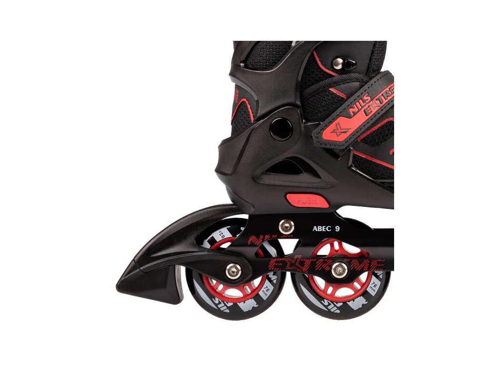 Kolečkové brusle NILS Extreme NA14174 jsou vhodné k rekreační jízdě po tvrdém a rovném povrchu. Podvozek brusle je vyroben z hliníku a je osazen PU kolečky o tvrdosti 82A s ložisky ABEC 9. Poloměkká bota je vyrobena z polypropylenu, který je velice odolný. Vložka je profilovaná a prodyšná. Brusle je možné pomocí stisku tlačítka a posunutí přední částí boty nastavit do jedné ze čtyř velikostí. Zapínání je řešeno klasickou trojkombinací (dvousekční přezka, pásek se suchým zipem a šněrování). Model NA14174 je určen pro začínající a středně pokročilé bruslaře.