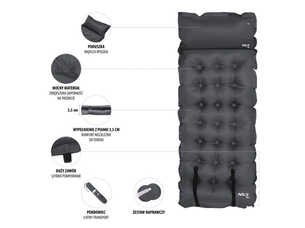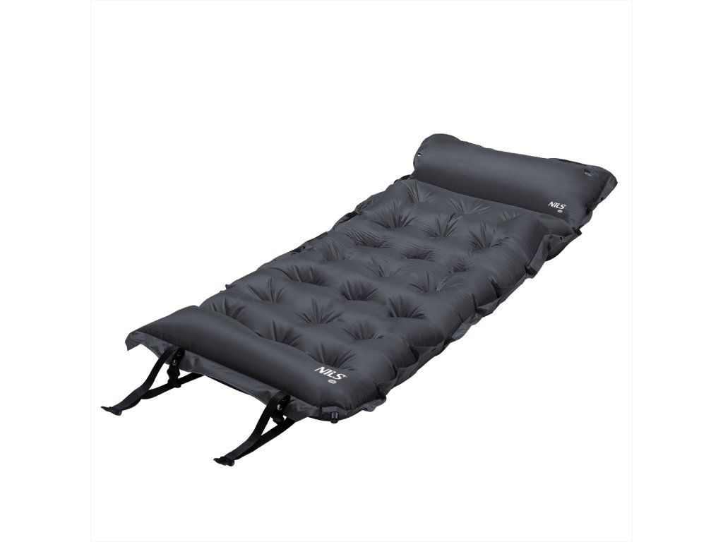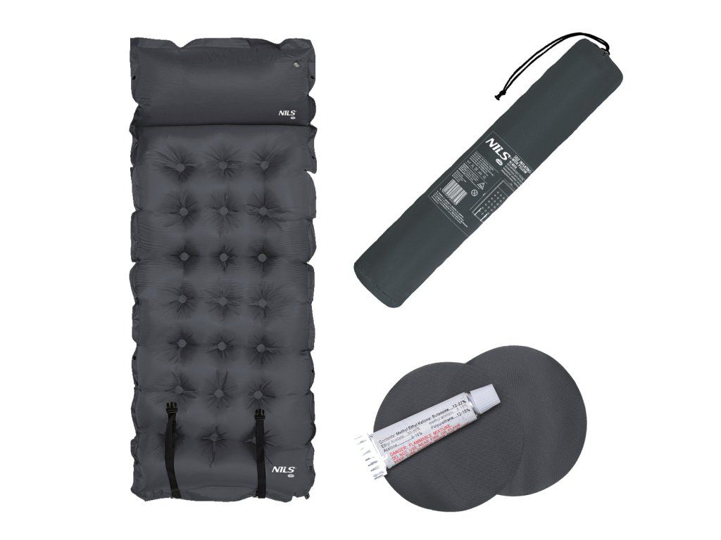 Samonafukovací karimatka NILS CAMP NC4018 zajistí kvalitní spánek během kempování a dovolených pod stanem. Podložka je ale vhodná i k vodě a všude tam, kde si chcete příjemně poležet. Samonafouknutí zajišťuje vnitřní, pěnový materiál s otevřenými póry. Po povolení ventilu do sebe nasává vzduch a dostává se tak do původního stavu. Závěrem je ještě potřeba podložku dofouknout na požadovanou tvrdost. Skládání se provádí otevřením ventilu a srolováním od opačné strany, než je ventil. Karimatku poté zajistíme řemínky s přezkami a vložíme do dodávaného vaku. Na model NC4018 byl použit velice odolný polyester 190T potažený vrstvou PVC, tato kombinace zajišťuje vysokou odolnost a karimatka se dá položit i na nerovný povrch. Lemy karimatky jsou opatřeny druky, které umožňují spojit více matrací do jedné, veliké plochy, toto se hodí například k vyplnění podlahy ve stanu. Polštářek není odnímatelný a oproti karimatce není vyplněn pěnou a je potřeba ho celý nafouknout. Součástí balení je také opravná sada, která se hodí v případě poškození.