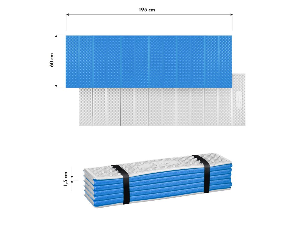 Podložka má délku až 195 cm, což umožňuje pohodlný odpočinek i pro vyšší osoby. Šířka 60 cm a tloušťka 1,5 cm zajišťují pohodlnou oporu a izolaci od podkladu, a to i na nerovném terénu.