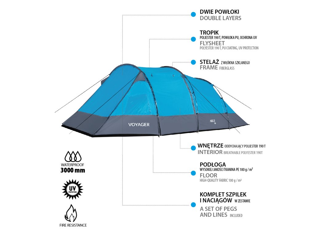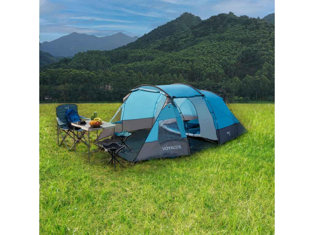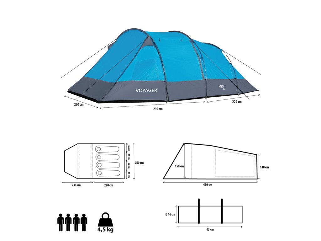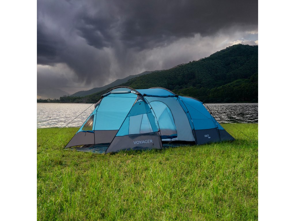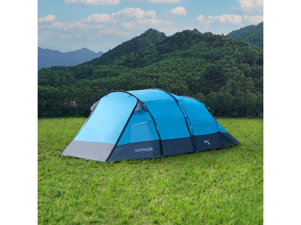 NILS Camp NC3027 Voyager je 4 osobový, kempingový stan tunelové konstrukce, který oceníte během teplých letních nocí při pobytu v kempu, nebo na zahradě. Stan Voyager je dvouplášťový a skládá se z prostorné předsíňky s podlážkou a jedné ložnice.
