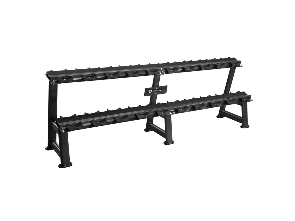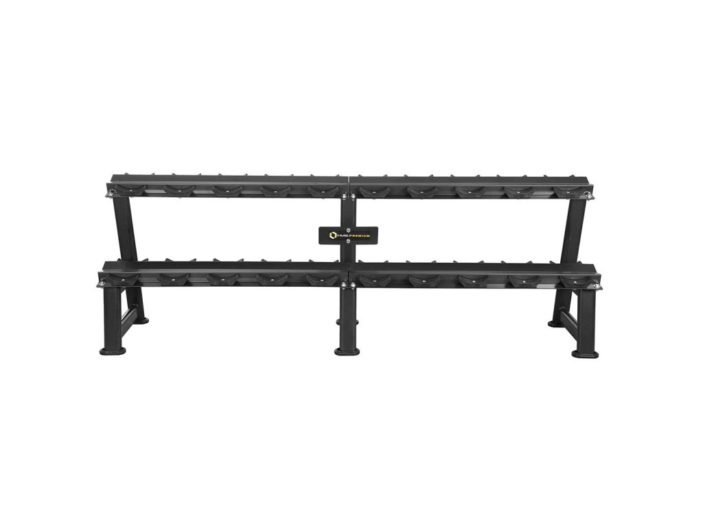Stojan na jednoruční činky HMS Premium STR23 je ideálním pomocníkem pro uložení 10-ti párů činek. Kvalitní, ocelová konstrukce ja vyrobena z profilu 80 x 40 mm, díky tomu unese zatížení až 1.000 kilogramů. Stojan STR23 má dvě "kolejnice" o rozměru 233 x 22 centimetrů, které jsou umístěny nad sebou pro snadnou orientaci mezi odkládaným náčiním. Ke každé polici jsou připevněny profilované, gumové podložky, do kterých se ukládají jednotlivé činky. Guma zamezuje pohybu činky a zároveň ji chrání před poškozením. Šest noh stojanu je opatřeno gumovými patkami, které chrání podlahu před jejím poškozením.