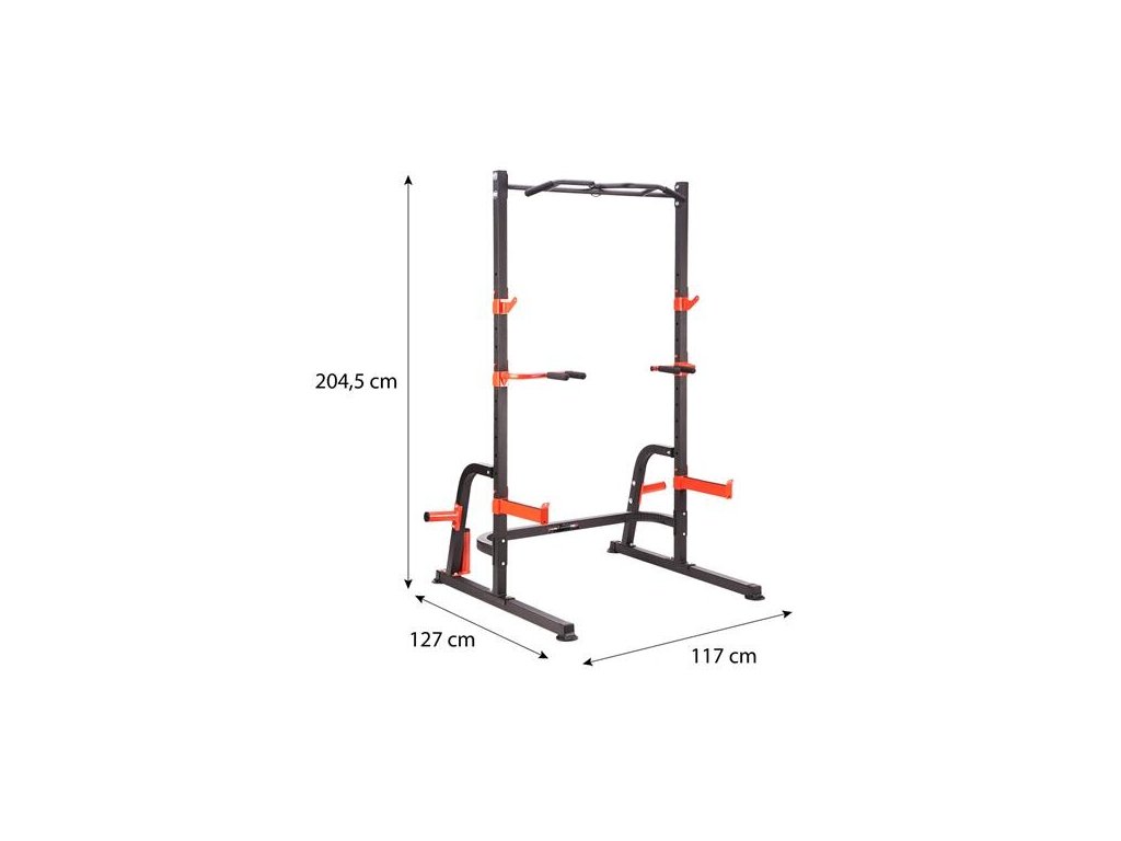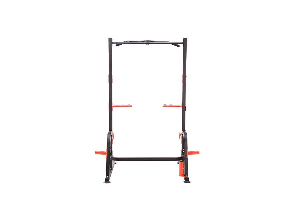 Celá konstrukce je vyrobena z oceli, díky čemuž je trvanlivá a odolná, rozměrná základna umožňuje dynamický trénink i při velkém zatížení. Maximální nosnost stojanu je 200 kg. Volné závaží je možné odkládat na 2 trny o délce 16 centimetrů. Podpěry pro dipy mají dvojitá madla a umožňují přizpůsobení správné polohy pro trénink. Tvarovaná hrazda nabízí 4 páry různých úchopů. Stabilizátory jsou osazeny koncovkamy, které chrání konstrukci a podlahu před poškozením a zároveň zvyšují stabilitu stojanu.