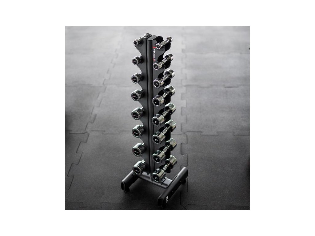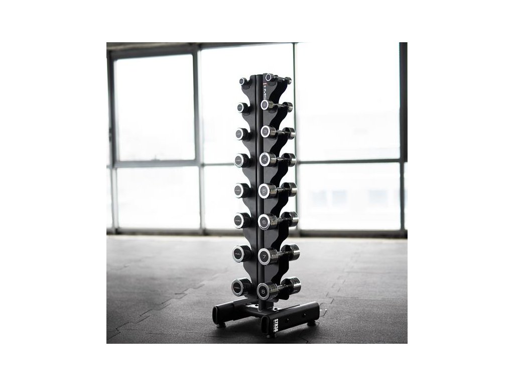 Stojan STR36, který je součástí sady, představuje robustní konstrukci navrženou pro pohodlné a estetické uložení činek. Díky kompaktním rozměrům je vhodný i do menších prostor a jeho vertikální design umožňuje snadný přístup ke každému páru činek. Stojan má maximální nosnost 75 kg, což zajišťuje bezpečné uložení celé sady činek. STR36 je perfektní volbou pro ty, kteří si cení pořádku a praktičnosti ve své tréninkové zóně.