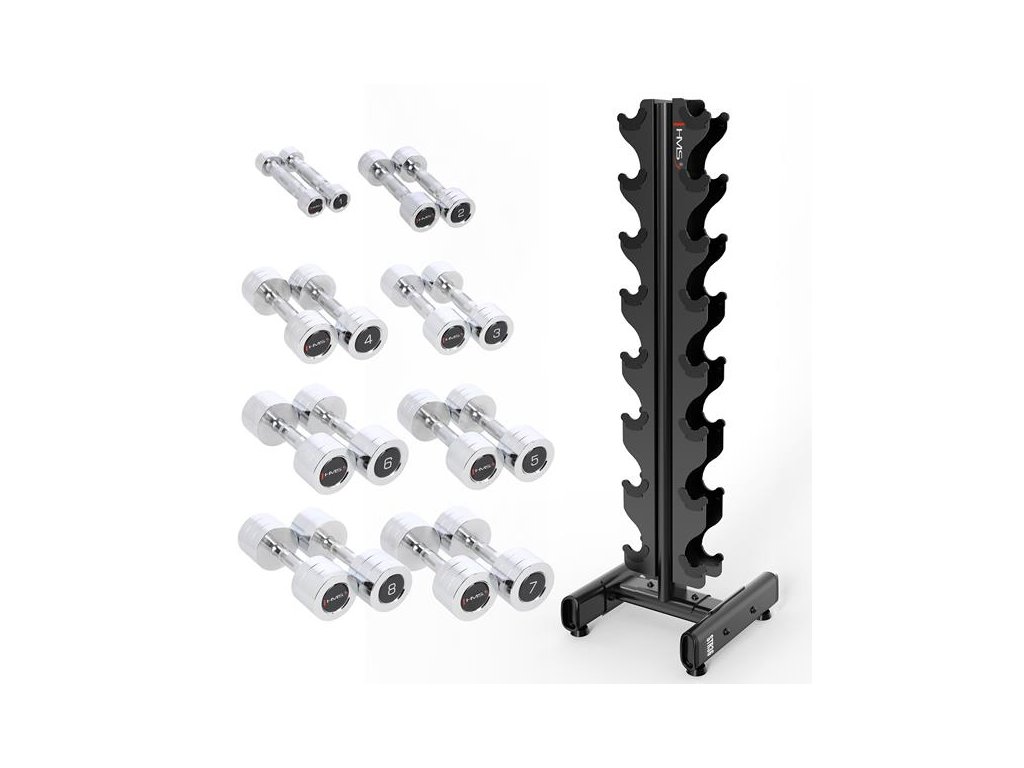 Sada činek CHD od značky HMS společně se stojanem STR36 je ideálním řešením pro ty, kdo hledají elegantní, funkční a kompaktní vybavení pro silový trénink. Sada obsahuje činky o hmotnostech od 1 do 8 kg, dodávané v párech, které dokonale pasují do vertikálního stojanu STR36.
