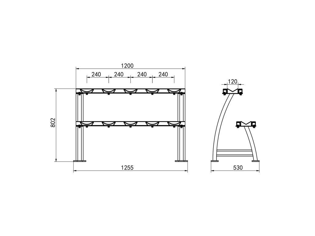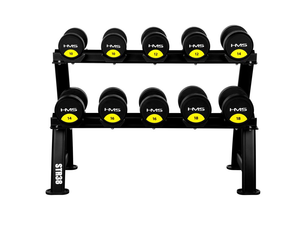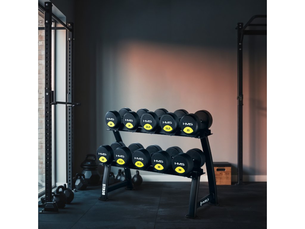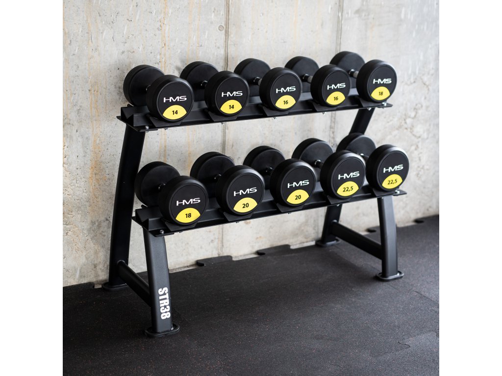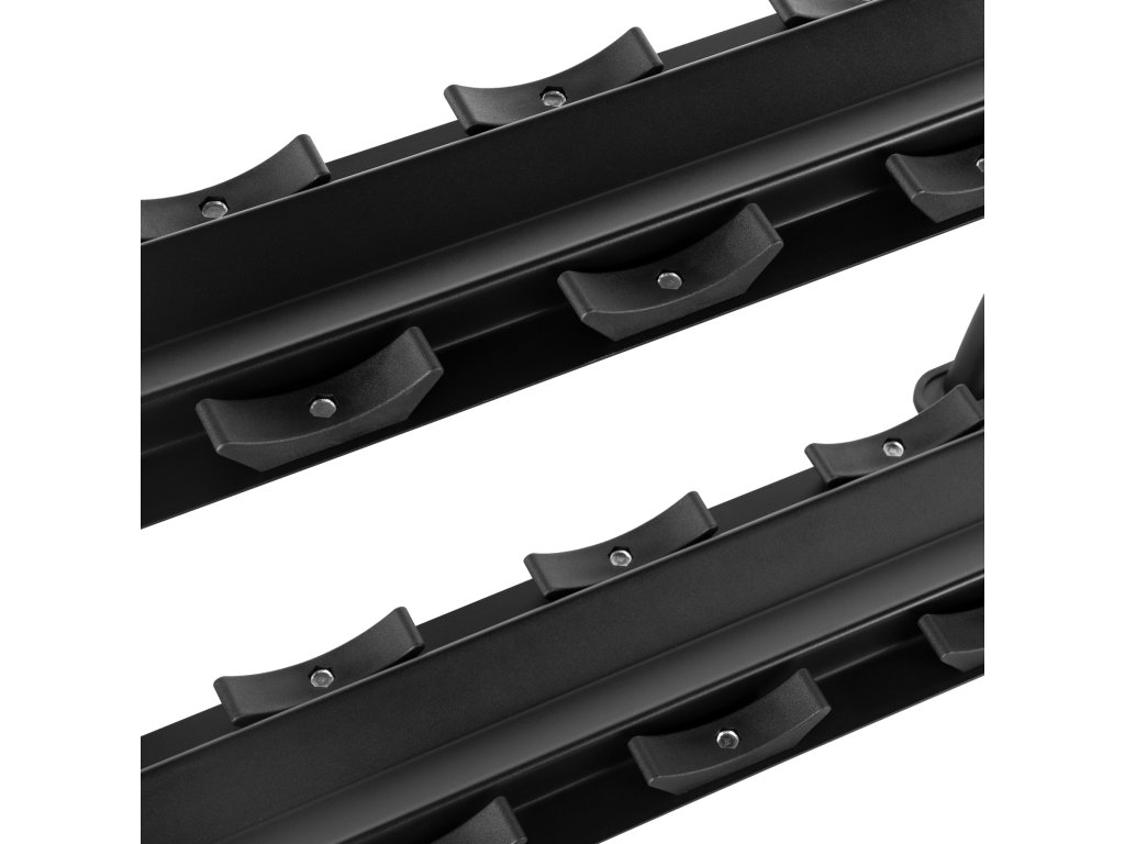 Stojan STR38 nabízí dvě úrovně pro uložení až 10 párů činek. Díky mírně nakloněnému povrchu je úchop činek pohodlný a nevyžaduje nadměrné ohnutí zápěstí, což snižuje zátěž kloubů a zvyšuje pohodlí.