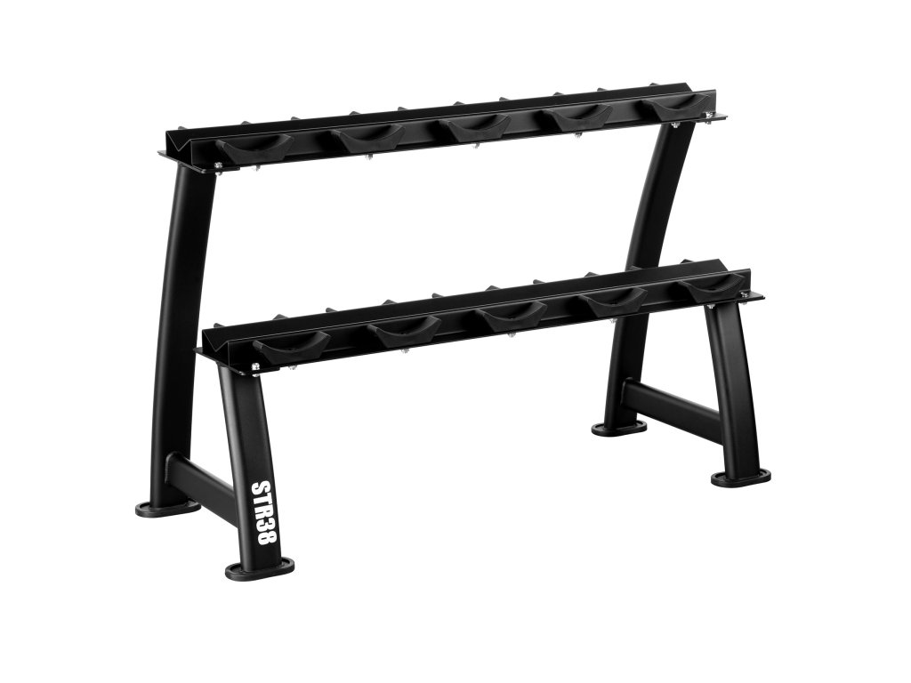 STR38 je robustní a funkční dvouúrovňový stojan na činky, který umožňuje přehledně uložit až 300 kg závaží. Díky široké, stabilní konstrukci a promyšlené ergonomii zaručuje maximální pohodlí a bezpečnost při používání zařízení.