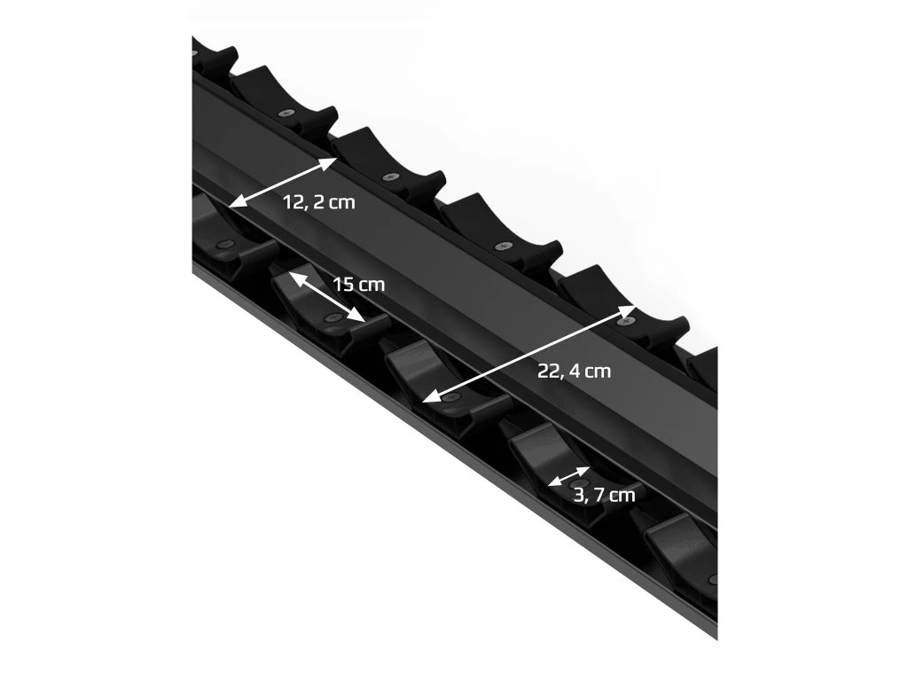 Každá police má bezpečnostní profil, který zabraňuje náhodnému sklouznutí činek. Díky stabilní konstrukci a kvalitním materiálům zůstává stojan bezpečný i při maximálním zatížení, což eliminuje riziko převrácení při intenzivním používání.