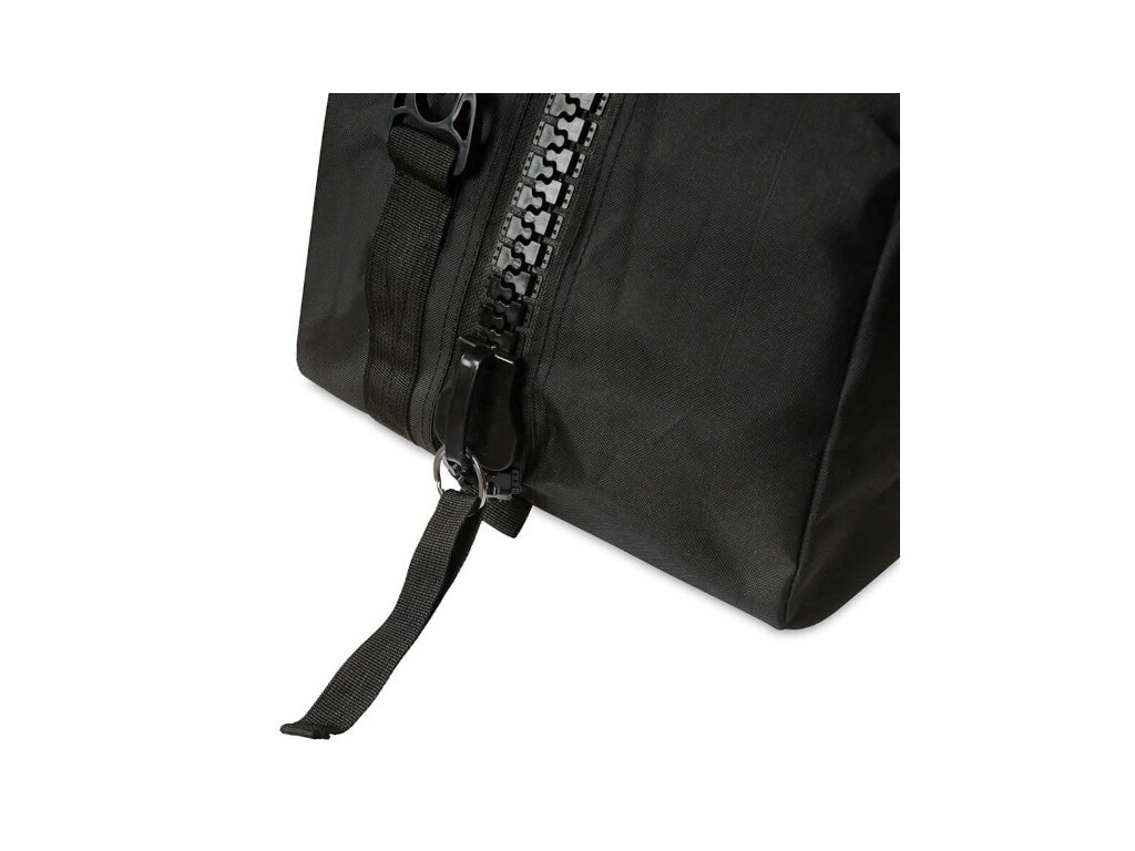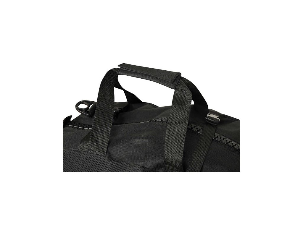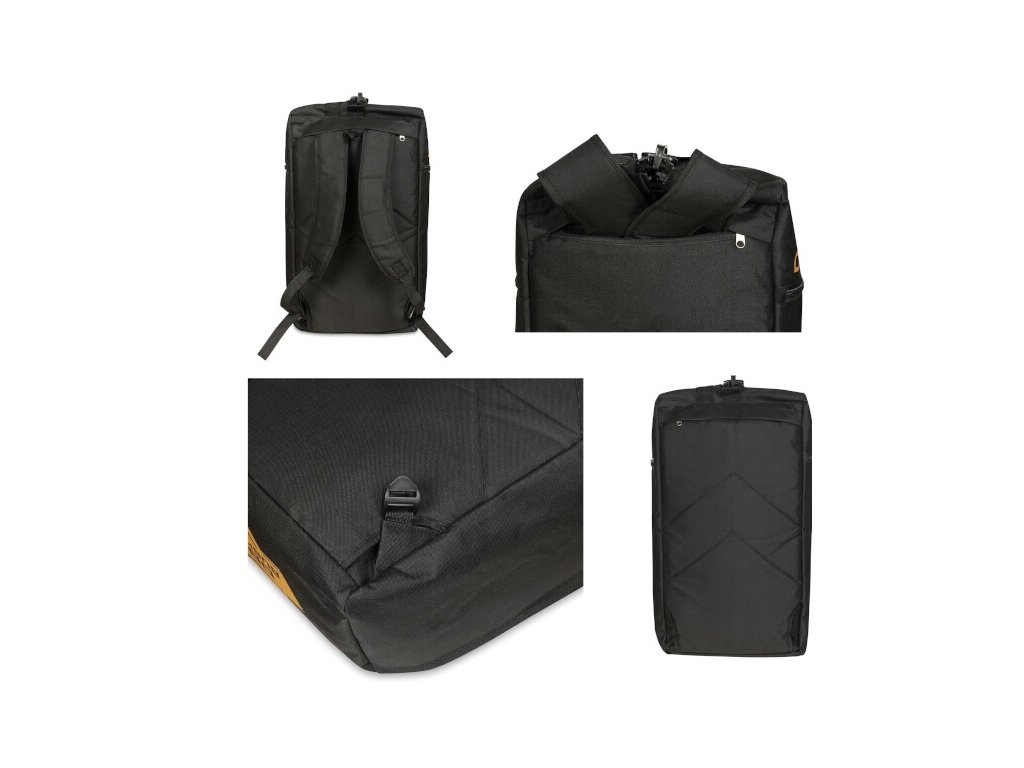 Taška je vyrobena z pevného polyesteru a vnější rozměry jsou 30 x 60 x 40 centimetrů, tato velikost tedy pojme veškerou výbavu potřebnou pro trénink. Produkt je vybaven celkem 4-mi komorami, velká hlavní komora se skrývá pod XXL zipem, 2 boční komory jsou určeny na drobnosti jako peněženka, telefon, nebo klíče a spodní komora ukrývá popruhy a zároveň (pokud tašku nosíme jako batoh) slouží jako kapsa na notebook nebo dokumenty. Přes vrchní komoru vedou 2 stahovací popruhy, které slouží ke zmenšení zavazadla a nebo pomáhají snížit napětí kladené na zip, pokud je taška plná. Samotný pelyester je velice pevný materiál, který je odolný vůči roztržení a vodě, zároveň se snadno udržuje v čistotě.