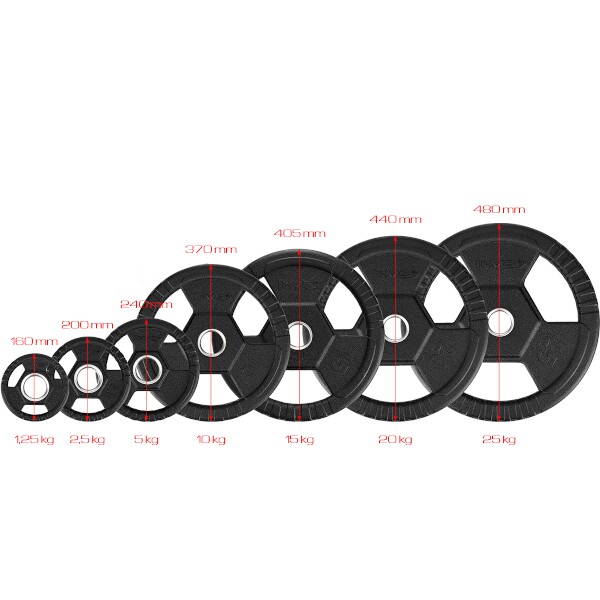 Vyroben z oceli pokryté tvrdou gumou, která chrání jak talíř, tak podlahu před poškozením. Navíc je vybaveny praktickými madly, které usnadňují manipulaci s kotoučem při nakládání a vykládnání z osy, ale také jsou ideální ke cvikům se samostatným kotoučem.